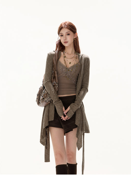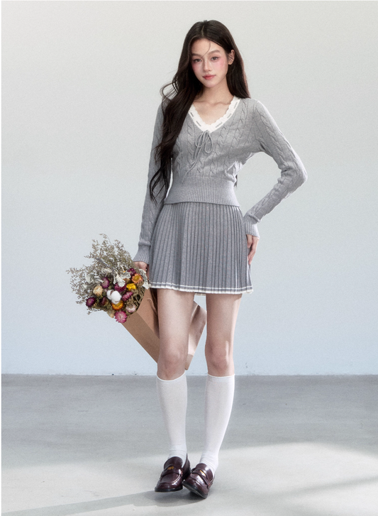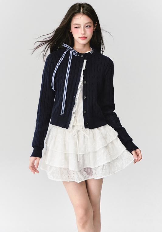 FRENCH CABLE-KNIT BOW CARDIGAN WITH CONTRAST PANELS