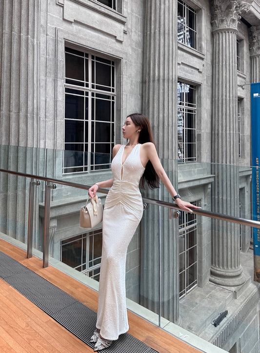 V-NECK HALTER NECK HOLLOW LONG DRESS