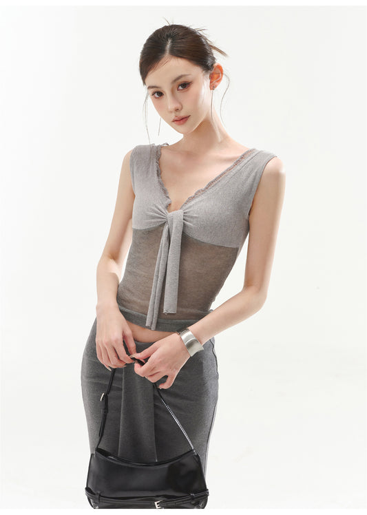 V-NECK SEXY RIBBED KNIT TANK TOP & LOW-RISE KNIT MERMAID BODYCON SKIRT