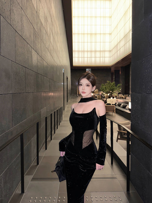 CELEBRITY FUR COLLAR OFF-SHOULDER DRESS