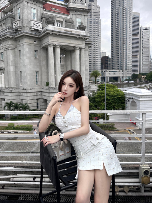 HALTER-NECK TWEED HIP-COVERING ONE PIECE