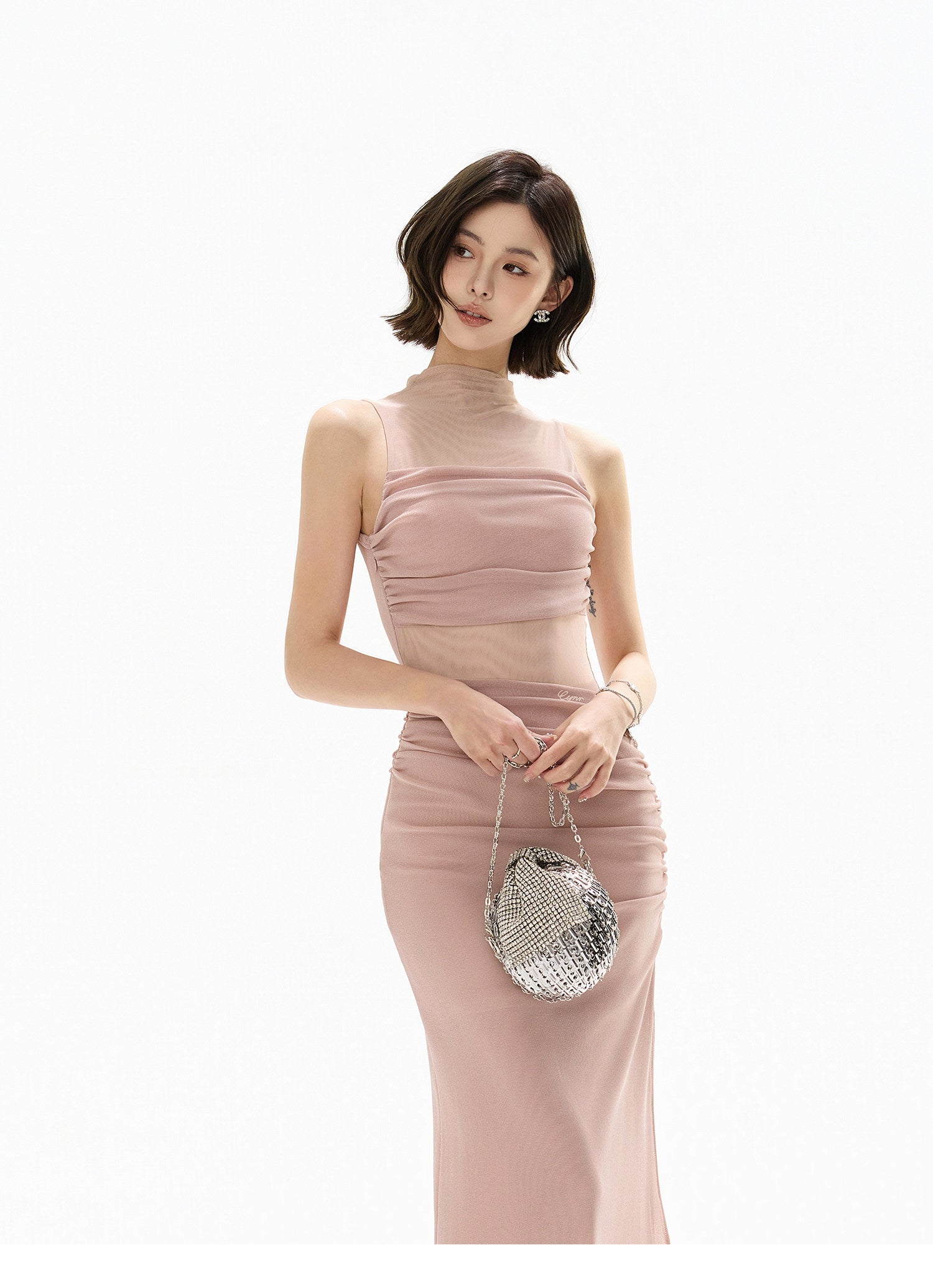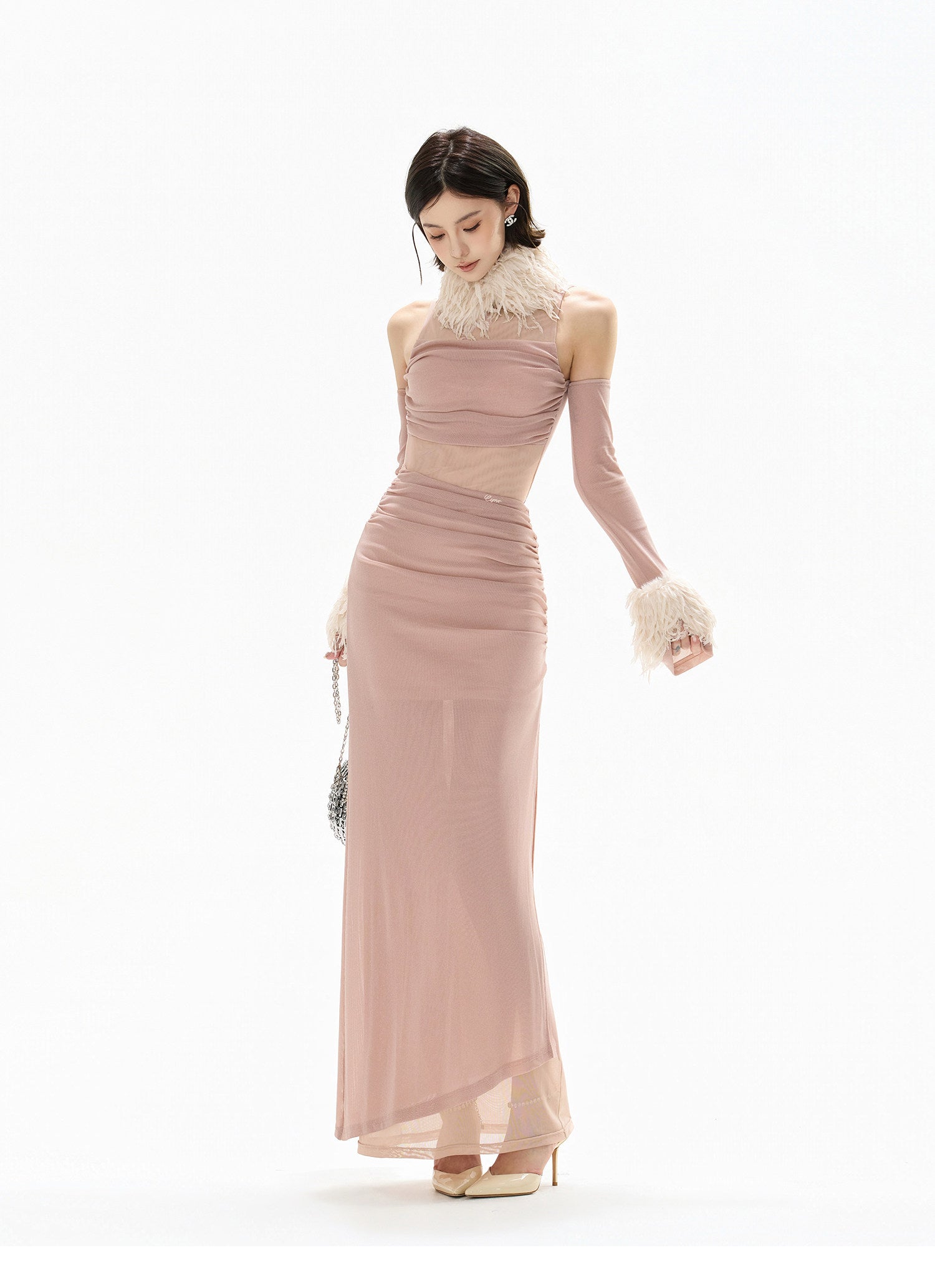 取り外し可能なフェザーストールで、3通りの着こなしが楽しめるミューズドレス。斜肩·ハイネックホルター·シンプルホルターと、シーンに合わせて印象を切り替えられます。ボディラインに沿うフィットシルエットが、女性らしい曲線を美しく演出。落ち感のあるロング丈が、動くたびに優雅な余韻を残します。フェザーありで華やかに、外せばミニマルに。ディナー·パーティー·撮影·特別な夜まで、幅広いシーンに対応する一着です。