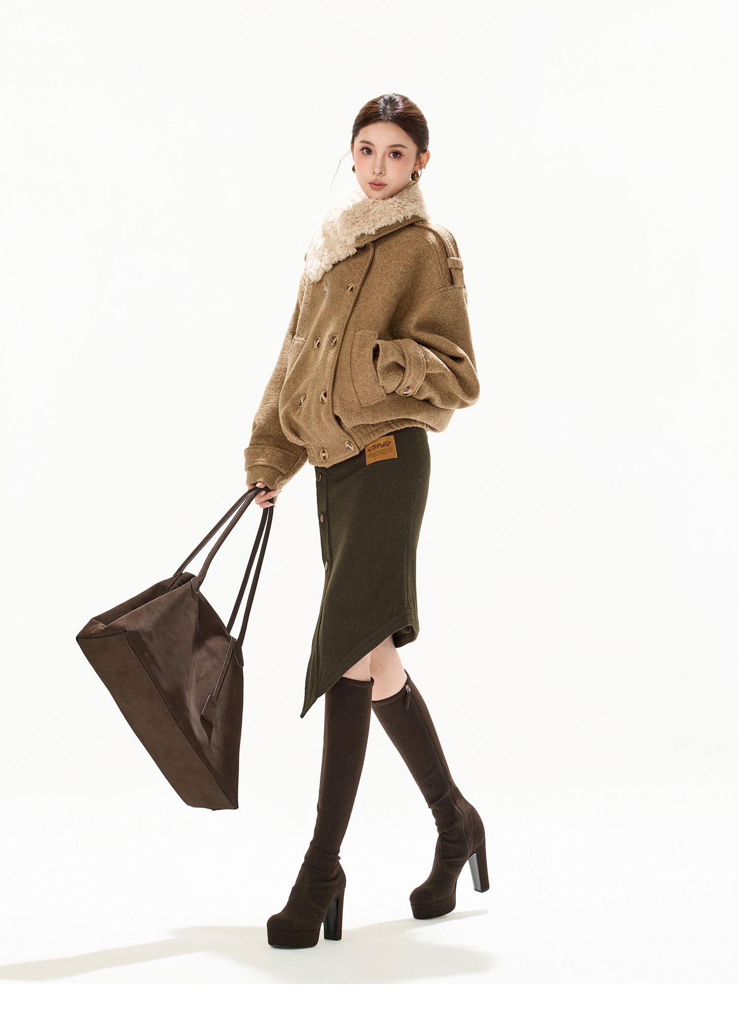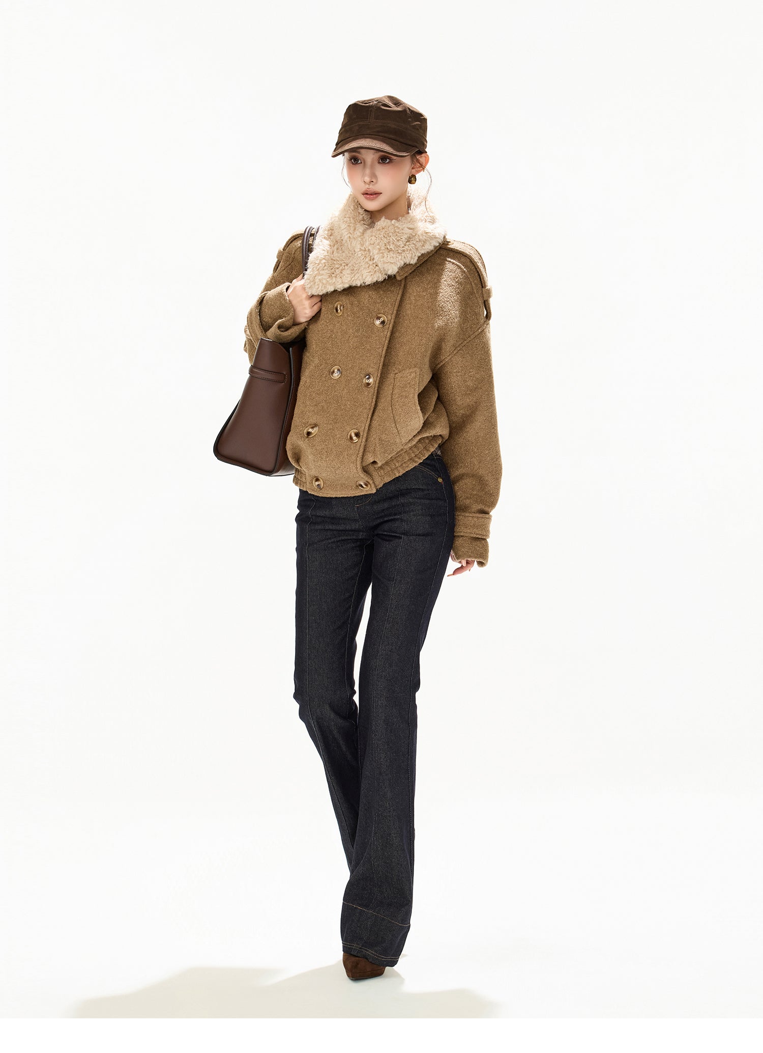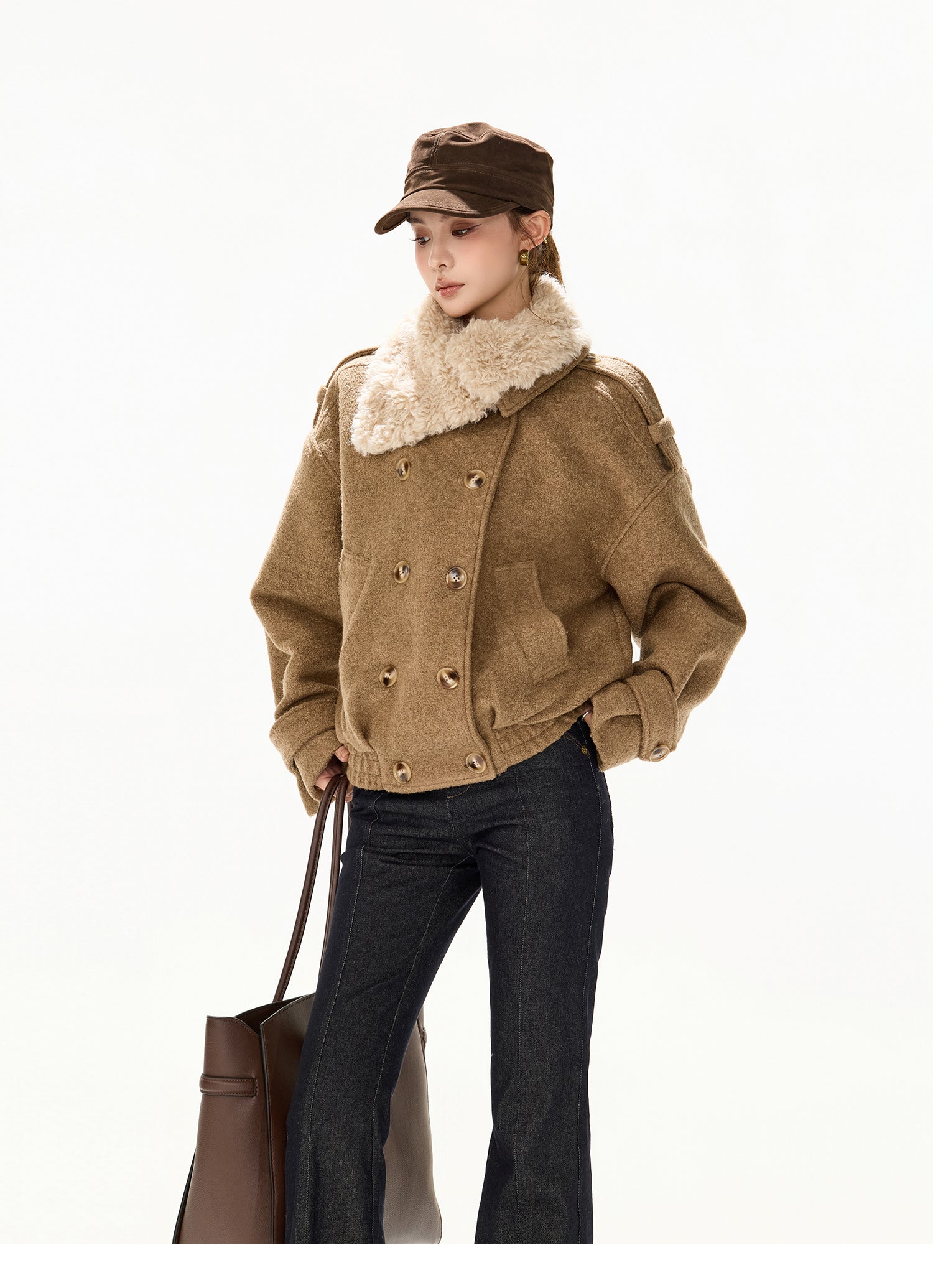 立体感のあるスタンドカラーに、取り外し可能なアシンメトリーファー襟を組み合わせた、デザイン性の高いショート丈ウールコート。ダブルブレスト仕様がクラシカルな印象を与えつつ、程よくゆとりのあるシルエットで今っぽいバランスに仕上げています。ファー襟は着脱可能なため、シーンやスタイリングに合わせて表情を変えられるのも魅力。ウール素材ならではの温かみと上質感があり、軽やかな着心地ながらしっかりと防寒性も兼ね備えています。デニムやスラックス、ワンピースまで幅広く合わせやすく、デイリーからお出かけまで活躍する一着です。