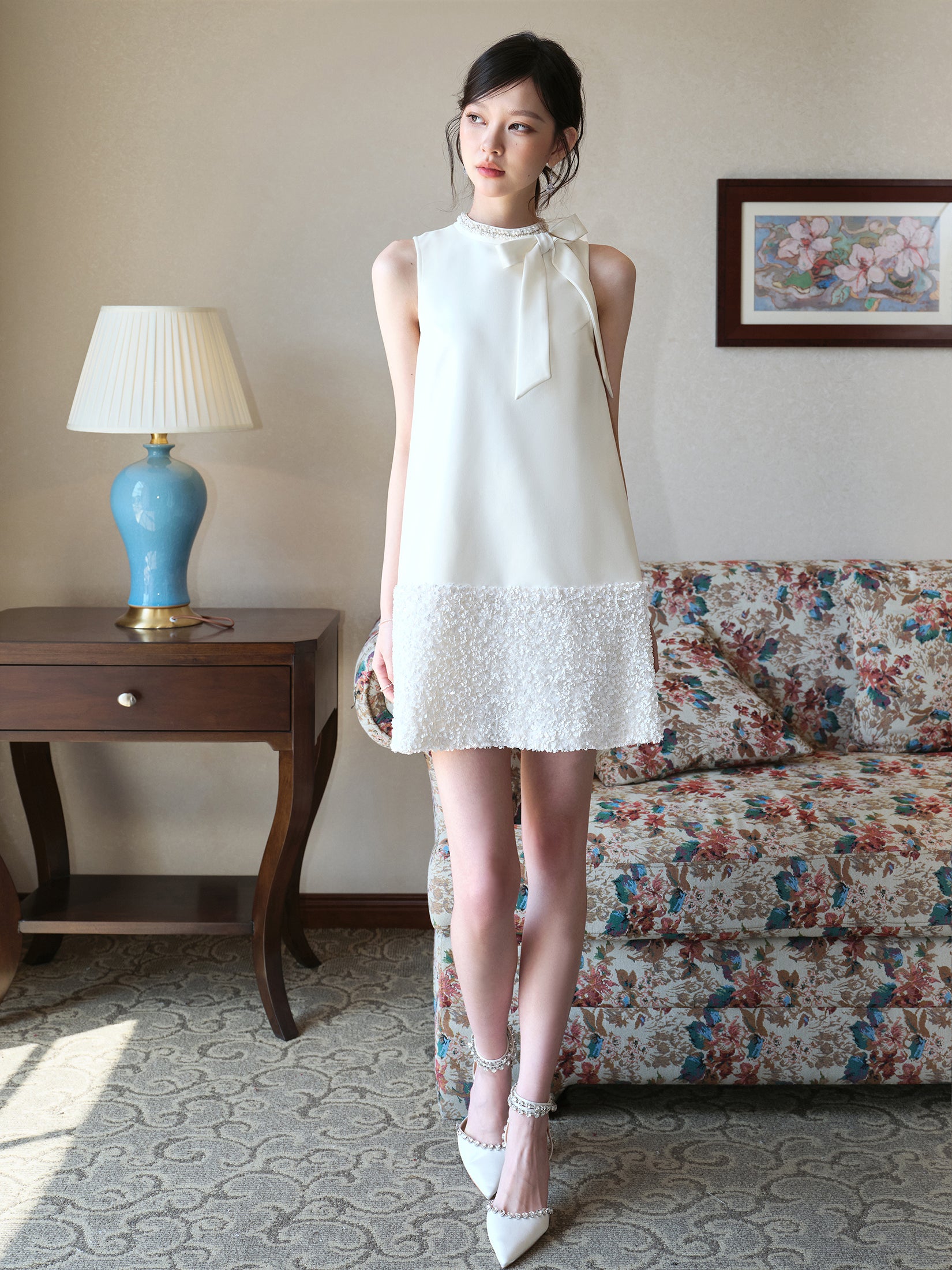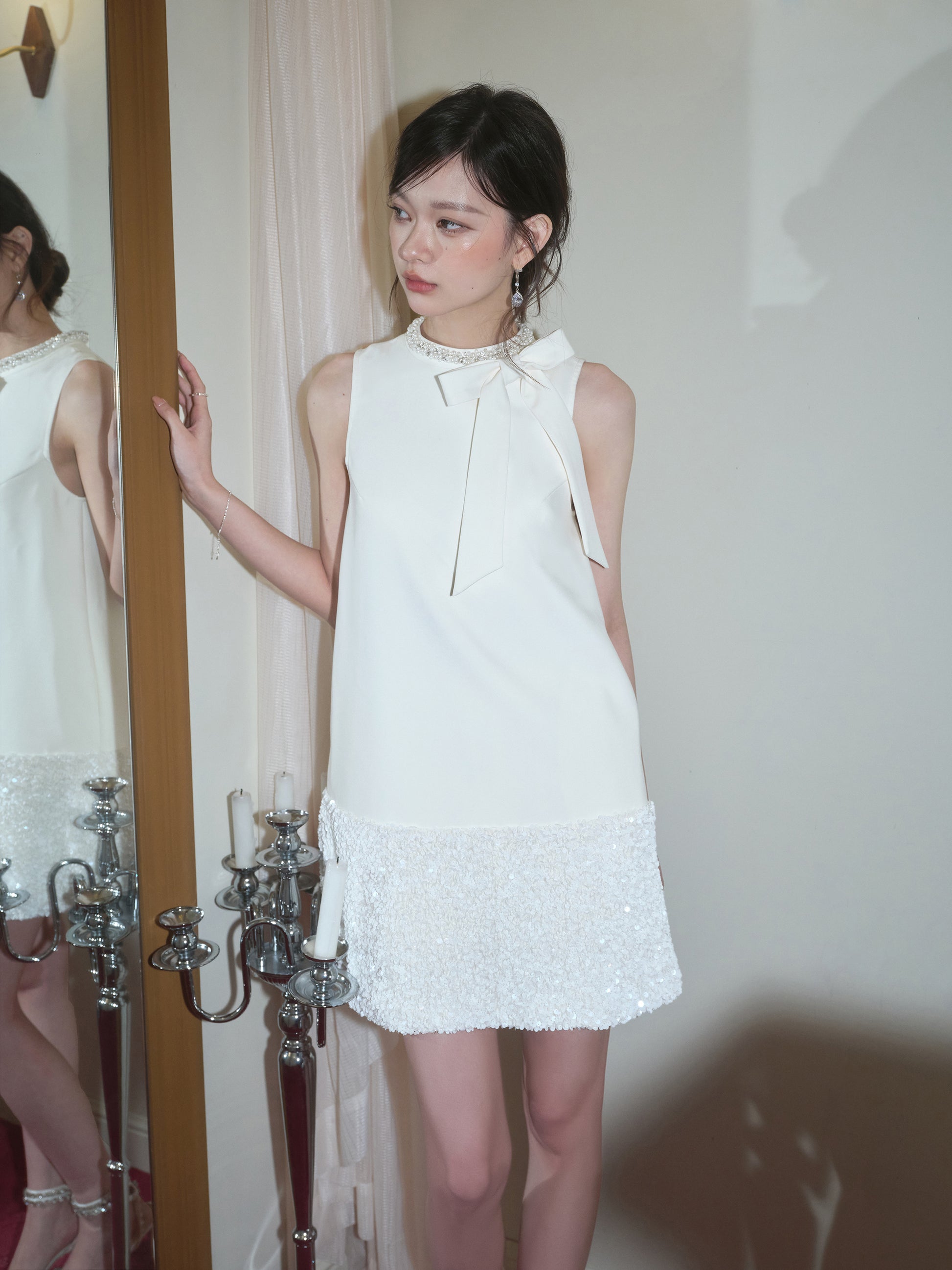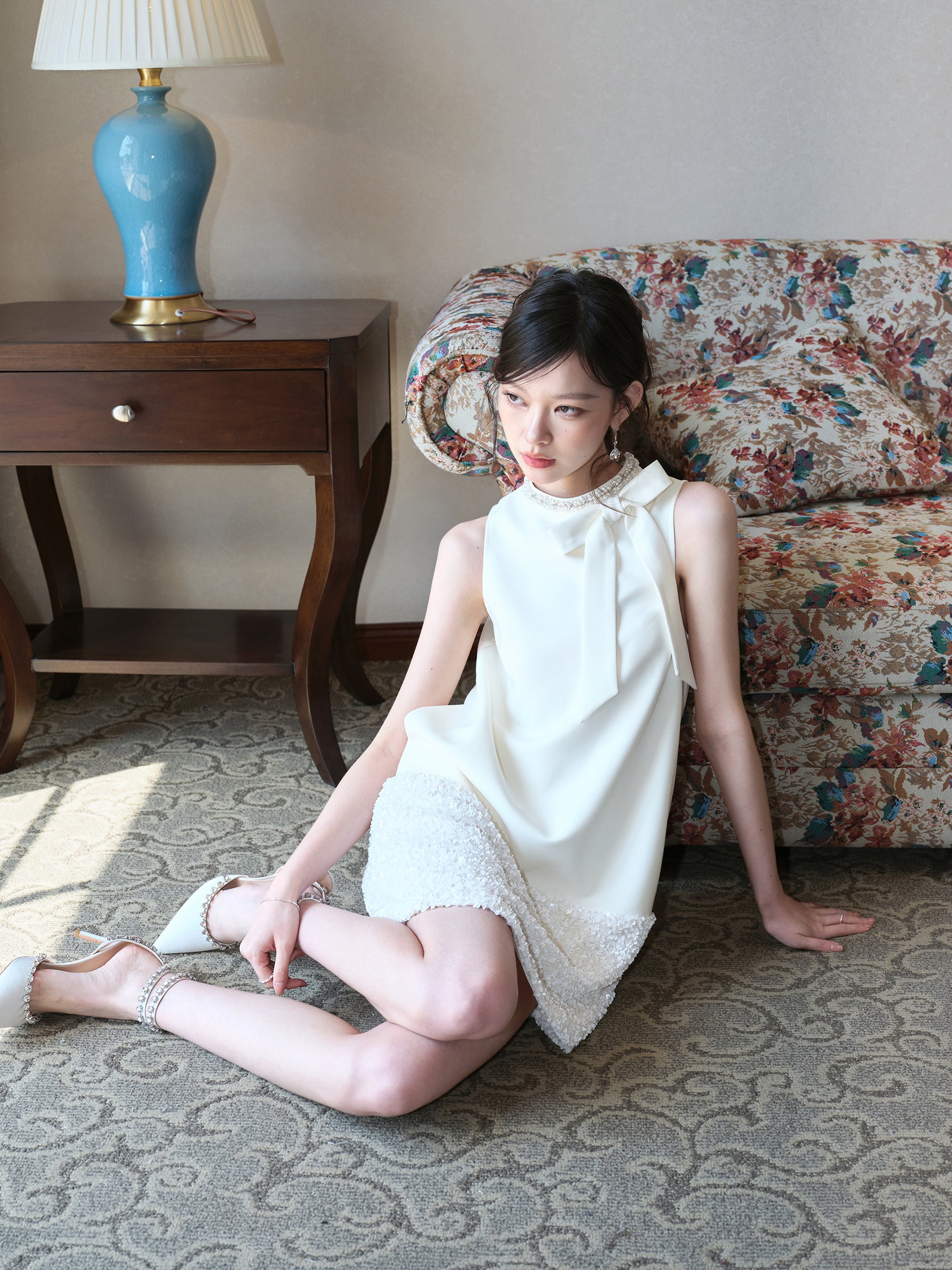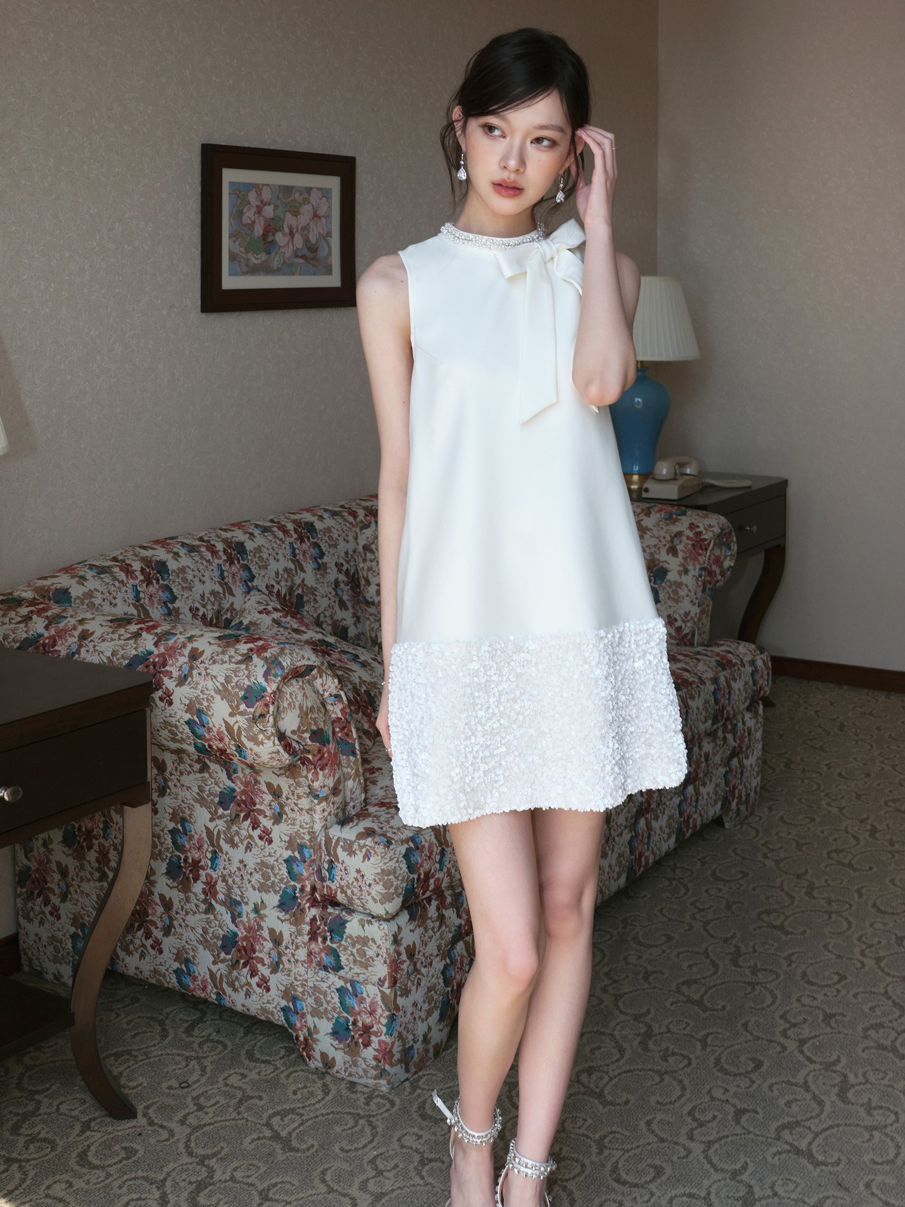 お嬢様風の気品漂うノースリーブワンピース。ラグジュアリーなベルベット生地にスパンコールを丁寧に施し、角度によってきらめく表情を楽しめます。ウエストラインを美しく見せるシルエットに、ハンドメイドのリボンディテールをプラスすることで、可憐さと華やかさを絶妙に両立。上品でありながら存在感のあるデザインは、夏の特別なお出かけやパーティー、デートシーンにも最適です。大人の女性らしいエレガントさを引き立てながら、どこか可愛らしさも感じさせる一着です。
