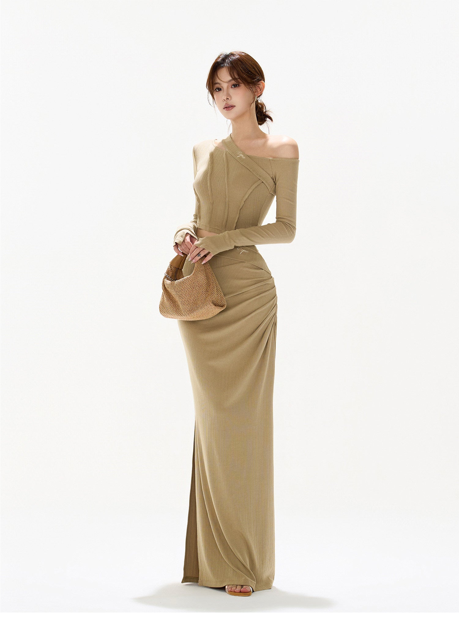 程よくフィットするニット素材を使用した、知性と色気を兼ね備えたセットアップ。斜めショルダーのトップスは、デコルテラインを美しく見せつつ、さりげない抜け感を演出します。ウエスト部分のラップ風デザインとカットアウトがアクセントとなり、ヒップラインに沿うロングスカートが女性らしいシルエットを強調。上品さを保ちながらも、トレンド感のある「大人の辣妹スタイル」を叶える一着です。セットでも単品でも着用可能で、幅広いシーンに対応します。