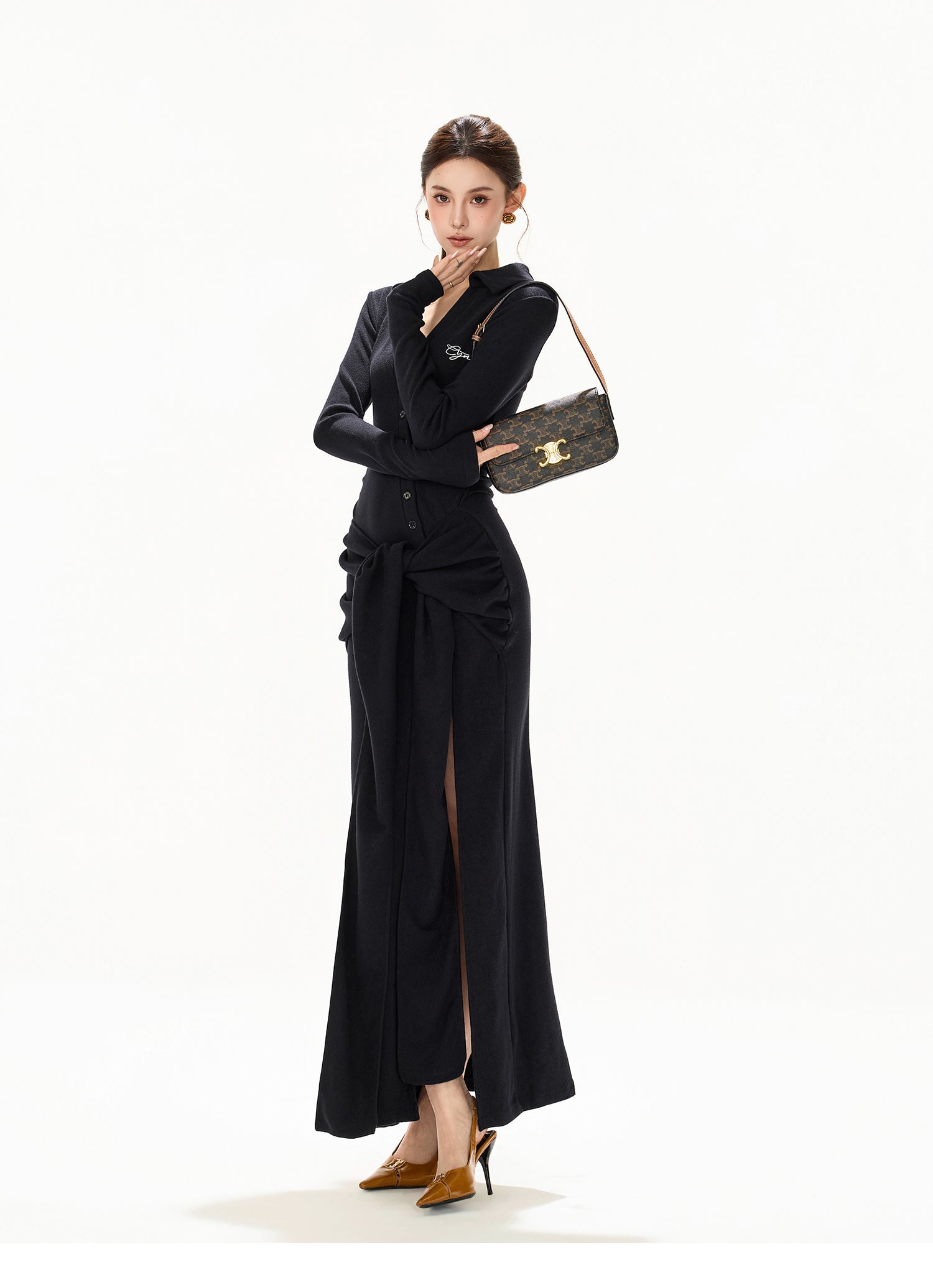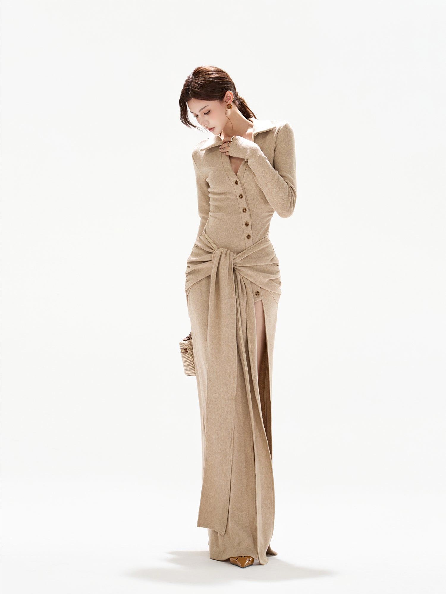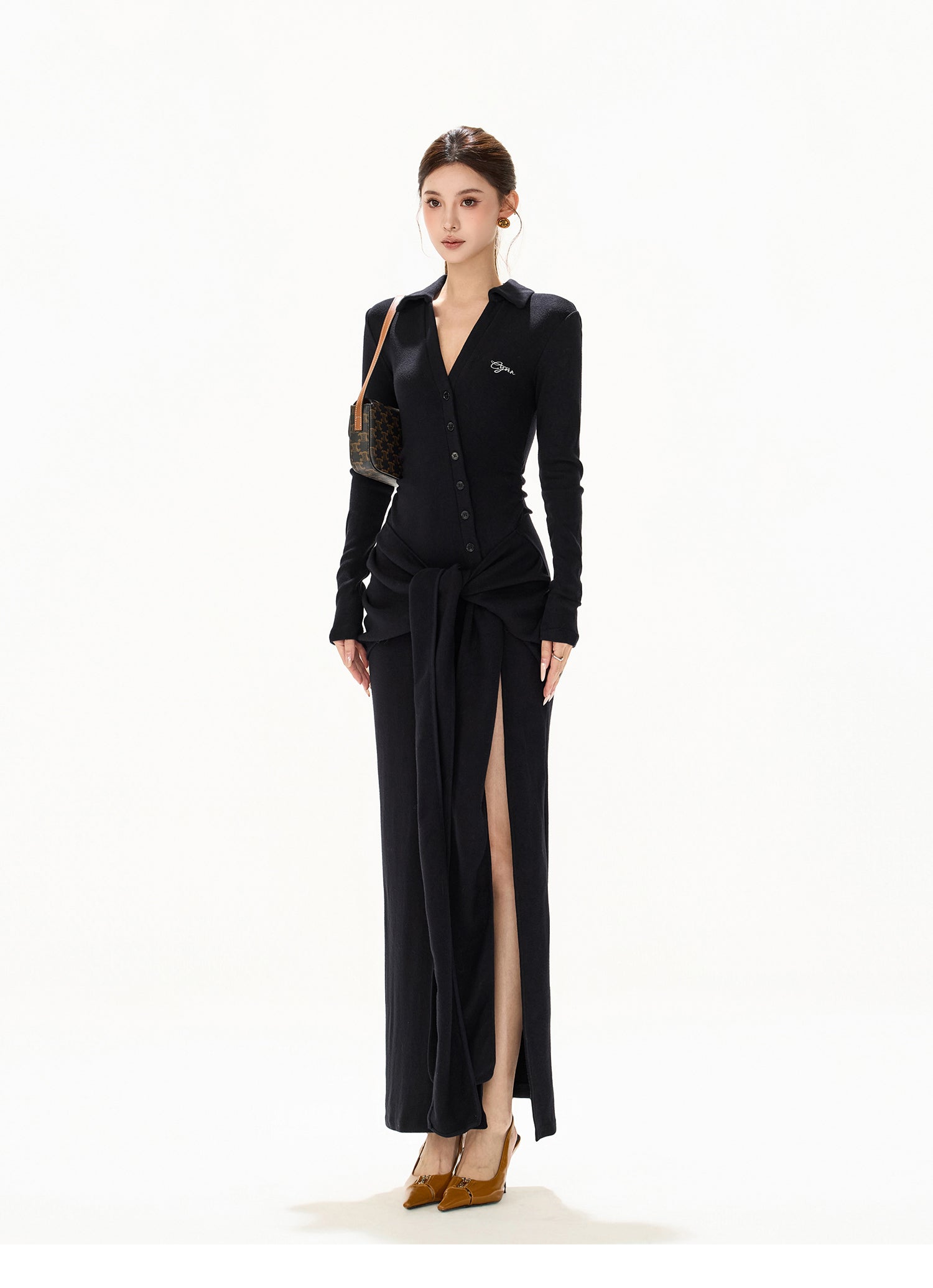 このドレスはウエストにリボンベルトをあしらったデザインが特徴で、スタイルアップを狙える巧みなポイント。視覚的にウエストラインを細く見せ、女性らしい曲線美を引き立てます。大胆なハイスリット仕様で、歩くたびにちらりと見える脚線美が、セクシーさとエレガンスを兼ね備えた魅力を放ちます;生地は厚みがあり、しっかりとした手触りと高級感が感じられる質感が魅力。着用時も型崩れしにくく、立体的なシルエットをキープ。斜め開きのフロントデザインと小さなテーラードカラーが、洗練された上品さとクールな雰囲気をプラスします。タイトスカートシルエットが体のラインを美しく見せ、女性らしさを最大限に引き出します;デートやパーティー、重要なイベントなど、あらゆるシーンで活躍する一着。これを纏えば、周囲の視線を集め、際立つファッションセンスをアピールすること間違いなしです。