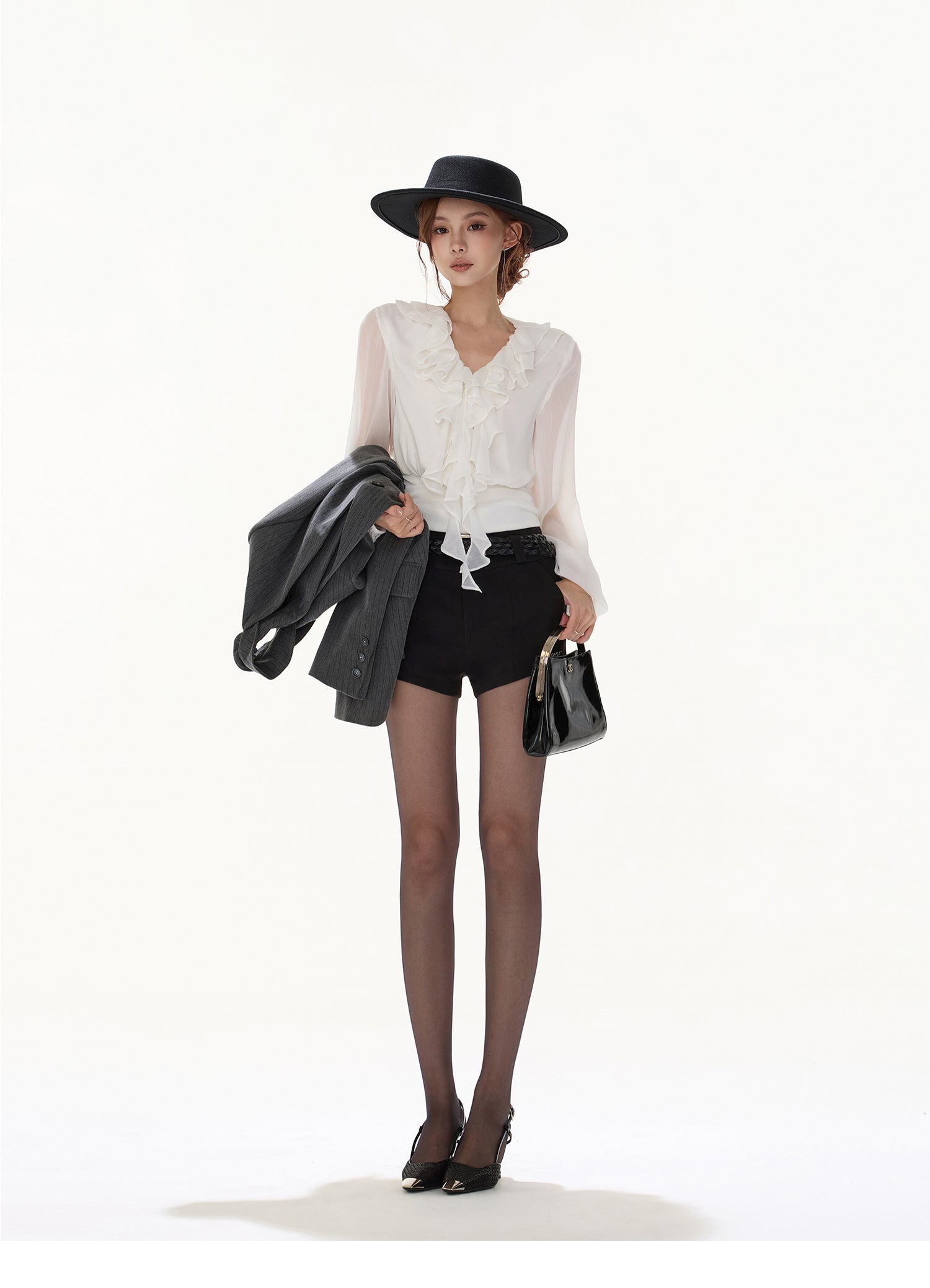 デートスタイルにぴったりな、上品でフェミニンなVネックフリルシフォンブラウス。柔らかなシフォン素材に、ウエストを絞ったショート丈シルエットが女性らしいラインを演出。後ろウエスト部分にはシャーリング加工を施し、ほどよい伸縮性で着脱も快適。Vネックが肩から首元をすっきり見せ、全体のバランスを美しく整える。ブラックのハイウエストショートパンツと合わせれば脚長効果抜群、さらにジャケットを羽織るとクラシックで優雅な印象に仕上がる一枚。