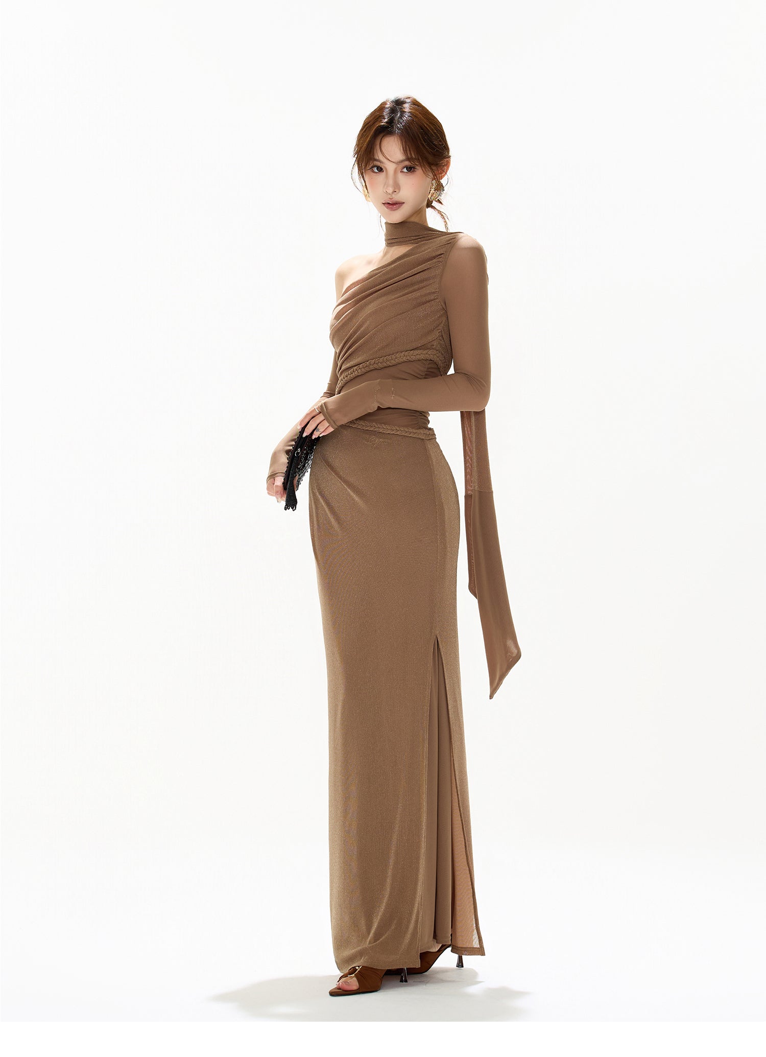 フレンチヴィンテージな雰囲気漂うアシンメトリーワンショルダードレス。編み込み風デザインとシアーメッシュの透け感が絶妙にマッチし、上品さと個性を兼ね備えた一着。ボディラインに沿うスリムシルエットで美しいプロポーションを演出。フォーマルなシーンから特別なパーティーまで、幅広いシーンで活躍するドレス。