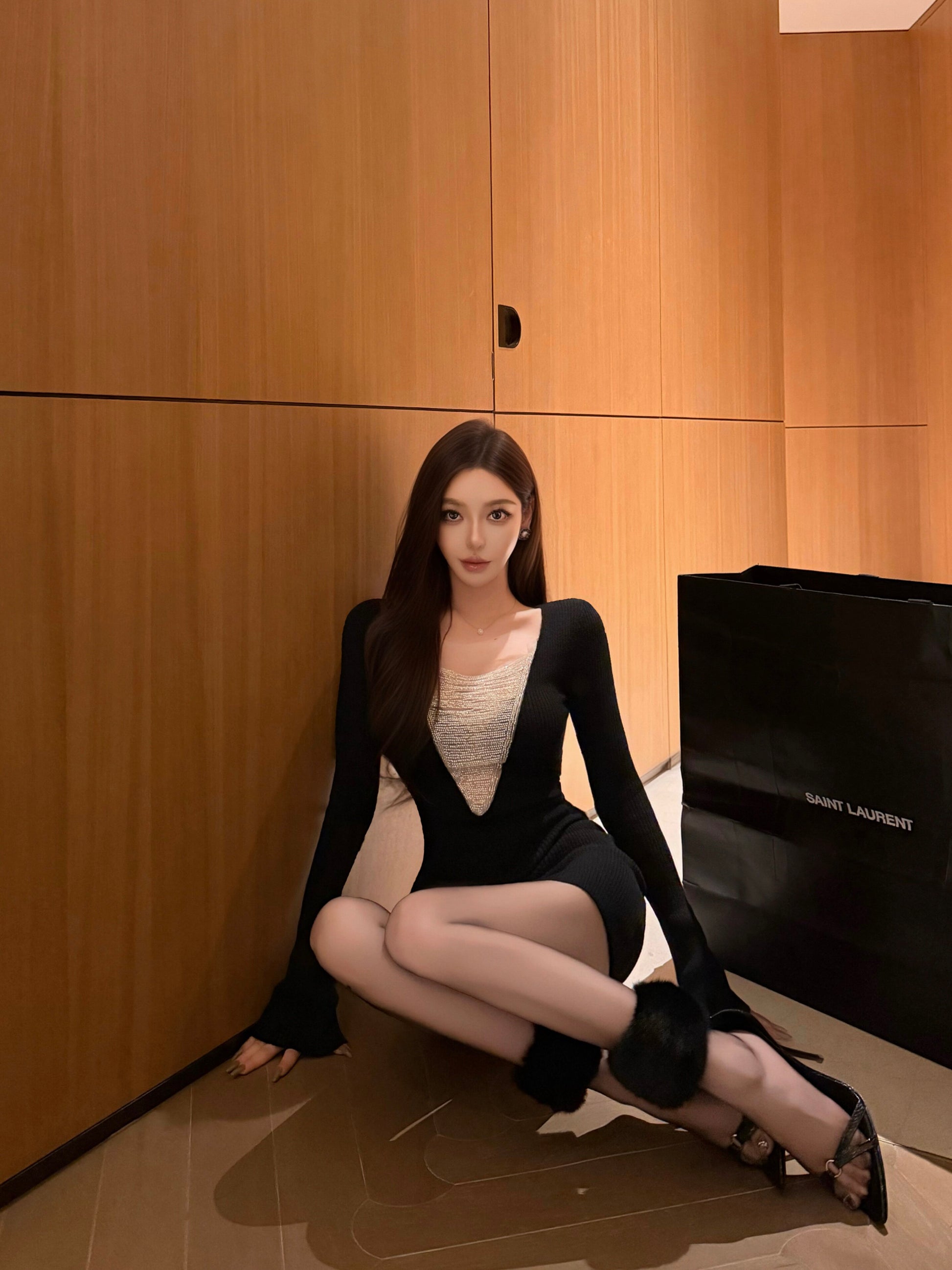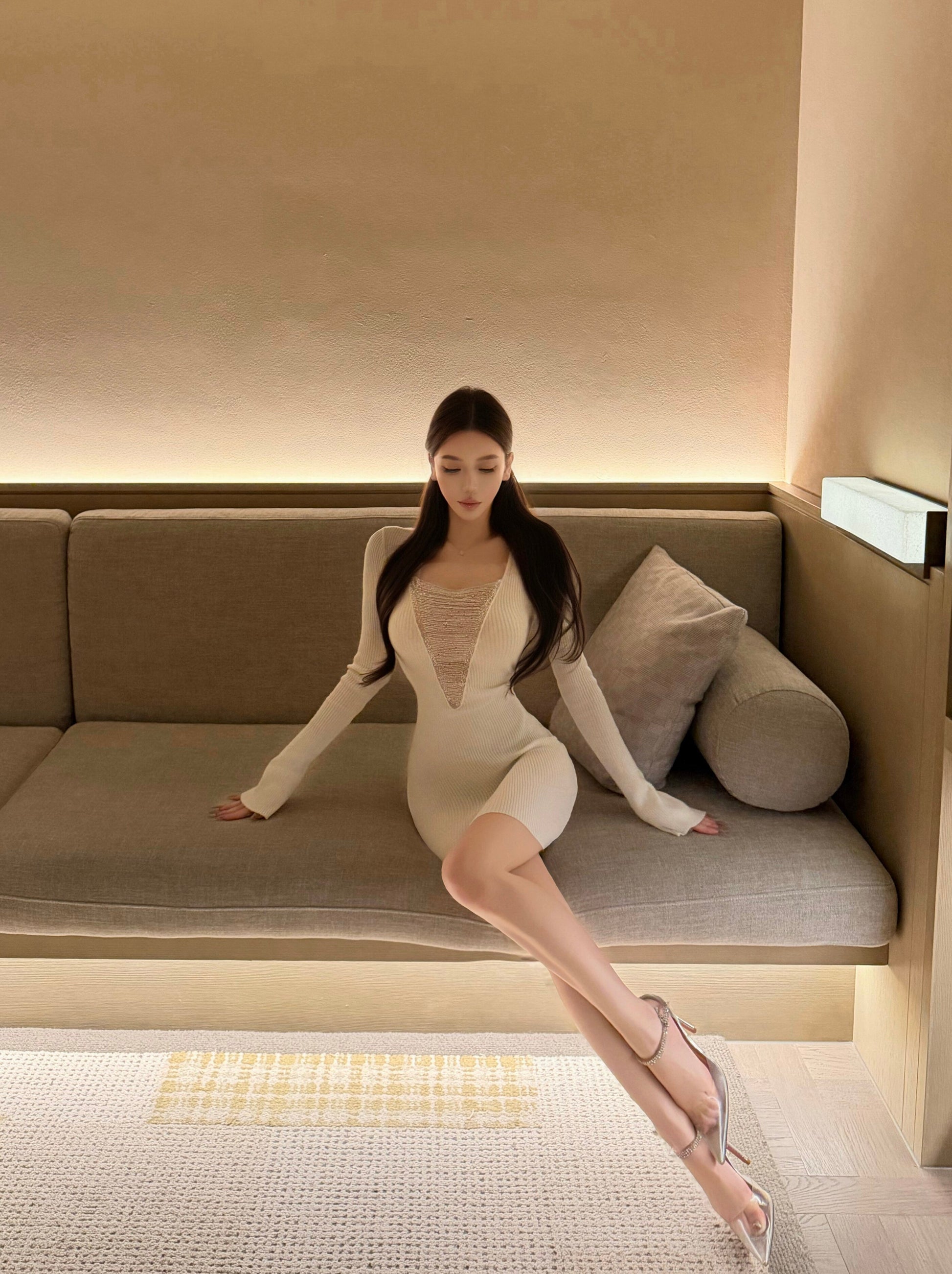 大胆に開いた大Vネックに、ラインストーンチェーンをあしらった長袖ニットワンピース。光を受けてきらめくチェーンディテールと、ギャラクシーを思わせるフリンジデザインが、動くたびに視線を惹きつける一着。柔らかく伸縮性のあるニット素材が、身体のラインに沿って美しくフィット。ウエストからヒップにかけての立体的なシルエットが、女性らしい曲線を引き立てながらも、過度にならない上品な色気を演出する。カットアウトデザインが程よい抜け感を与え、ブラックはクールでモードな印象、ホワイトは洗練されたエレガントなムードに。一枚で完成する主役級ドレスとして、ナイトシーンや特別な日におすすめ。