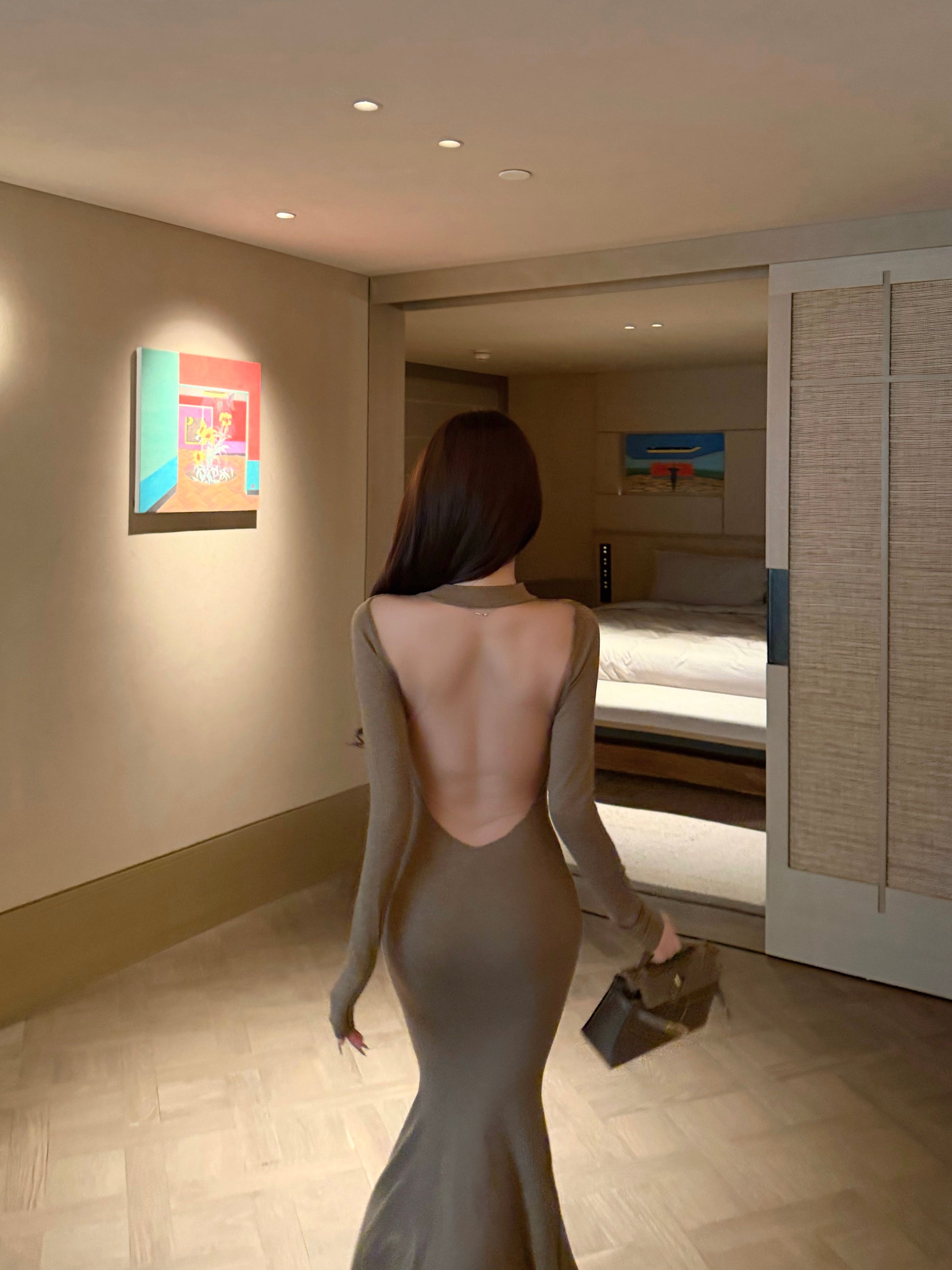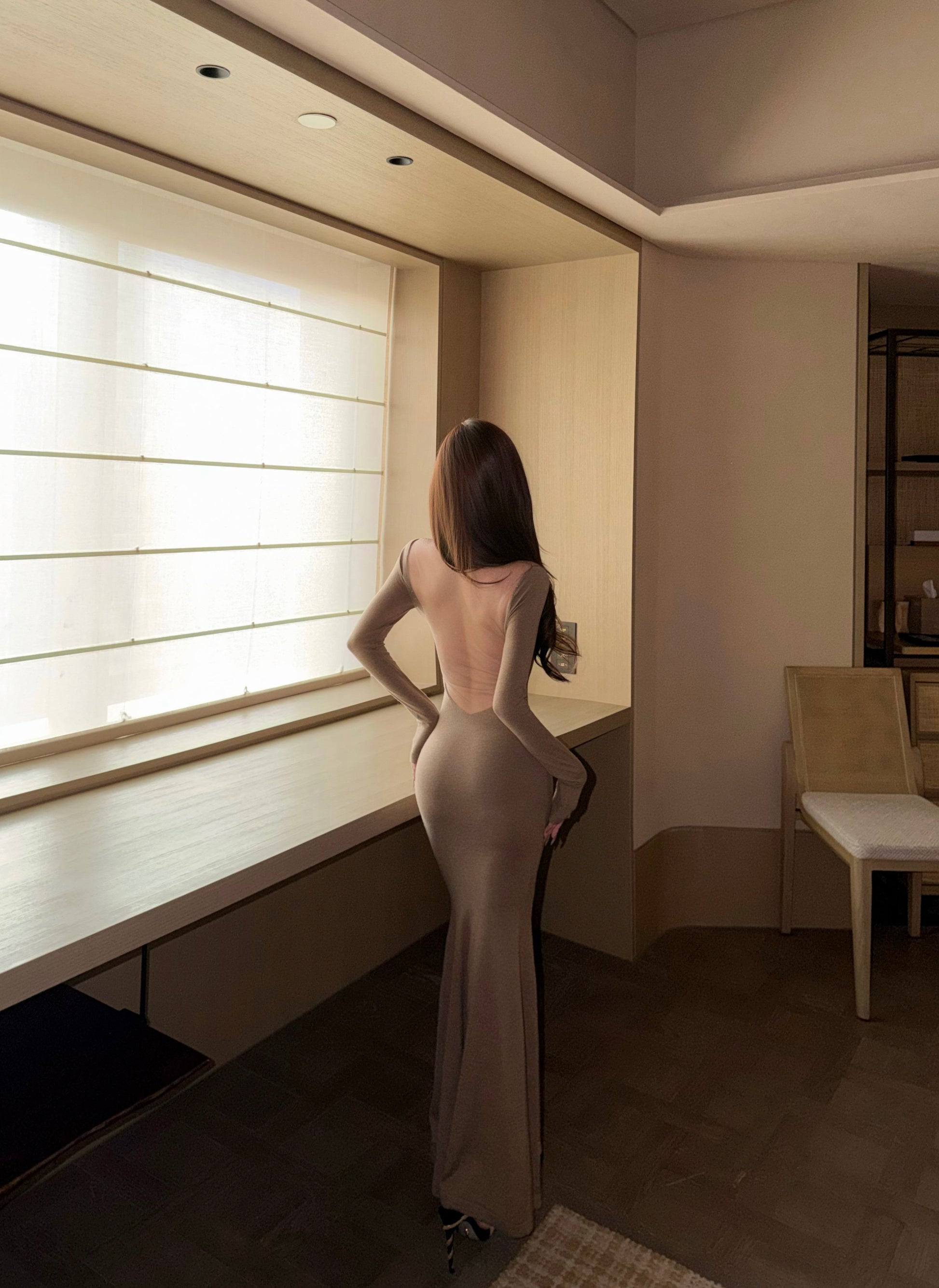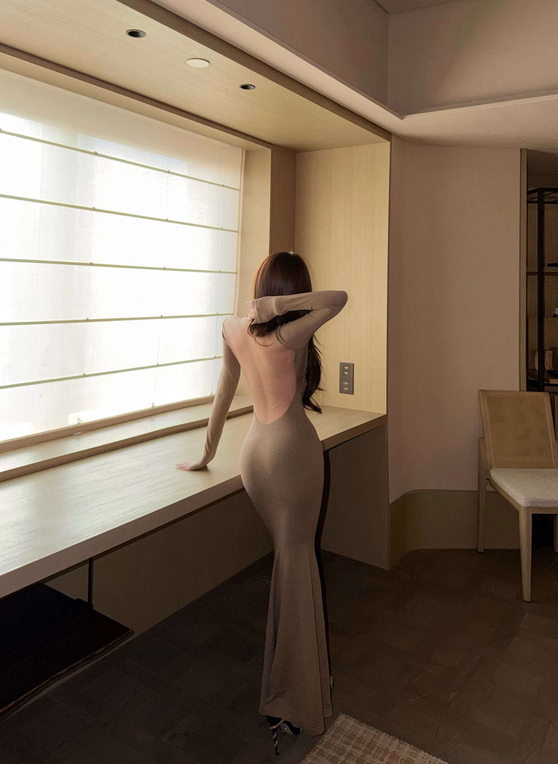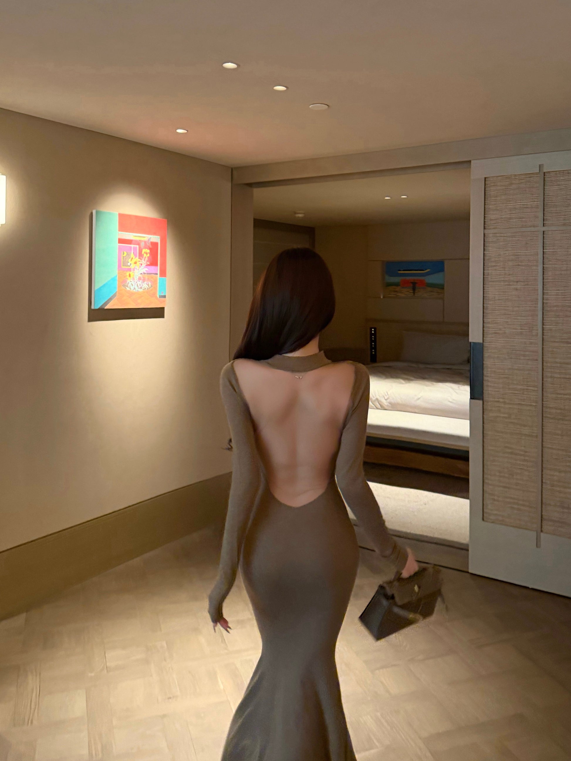 大胆に背中を大きく開いたホルターネックデザインが印象的な、長袖ニットロングワンピース。首元から背中へと流れるラインが美しく、後ろ姿まで計算された一着です。柔らかく伸縮性のあるニット素材が、身体に沿って自然にフィット。ウエストからヒップにかけて包み込むようなシルエットに、裾へと広がるマーメイドラインが、女性らしい曲線をより印象的に引き立てます。大胆なバックレスデザインでありながら、長袖とのバランスにより上品さを保ち、一枚で主役になる完成度の高いロングドレスに仕上げました。ナイトシーンや特別な日の装いに、自信を与えてくれる一着です。