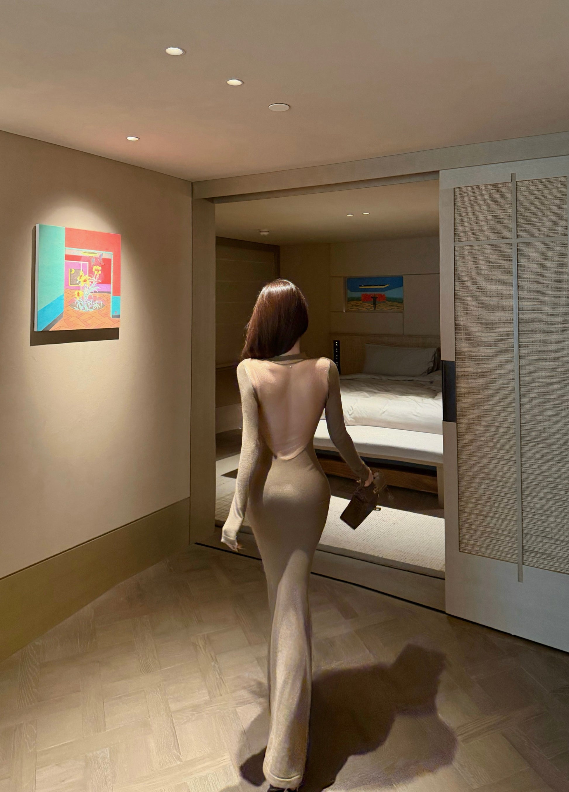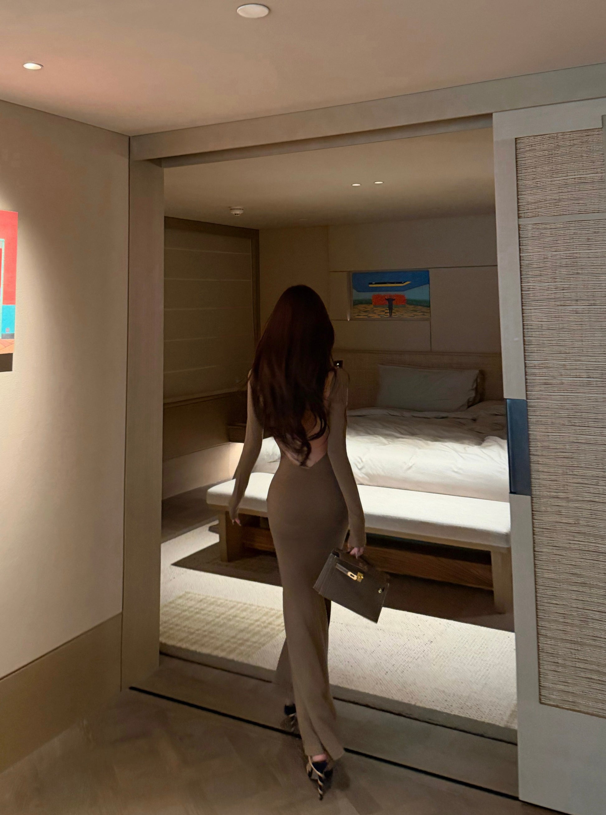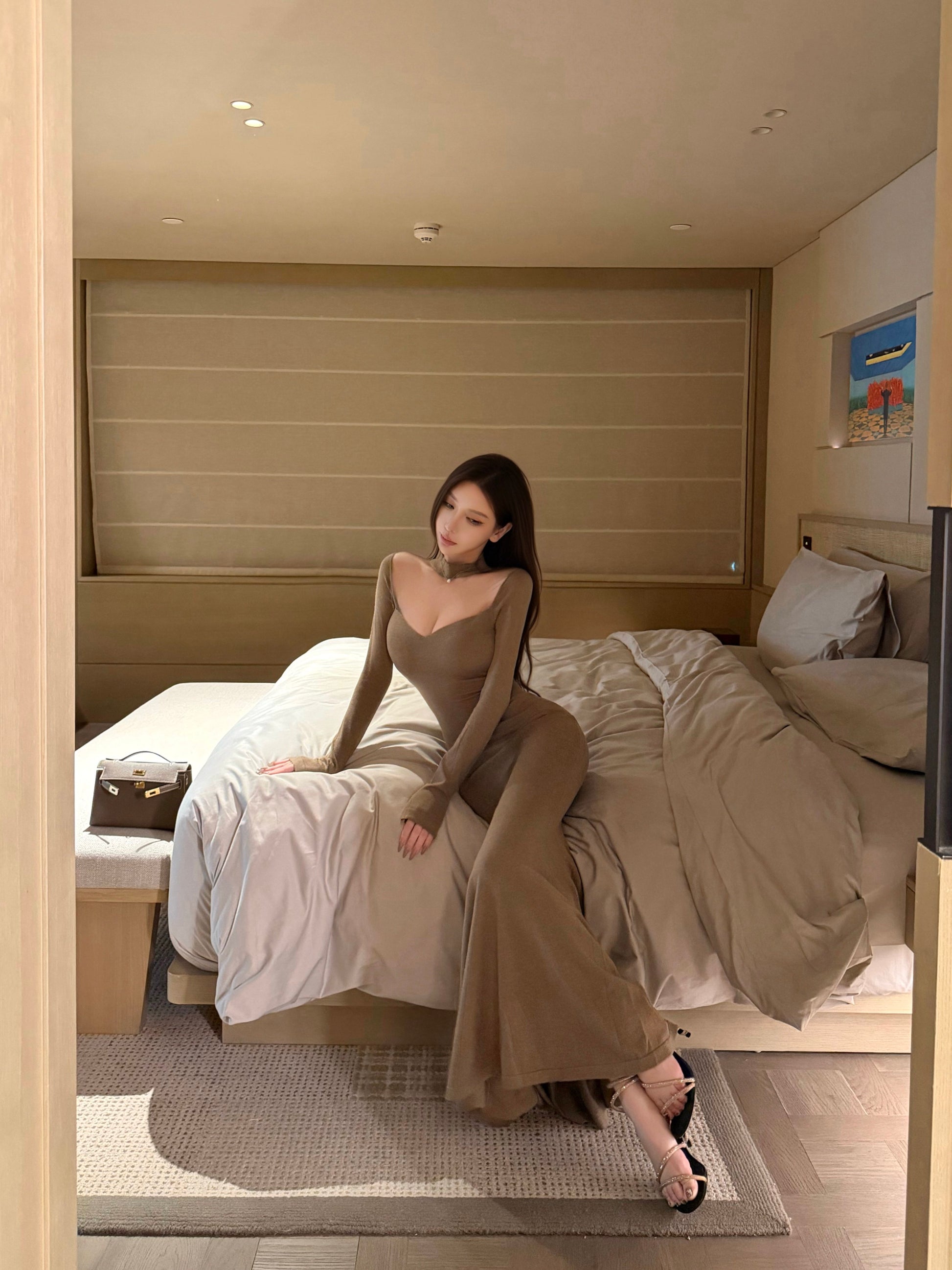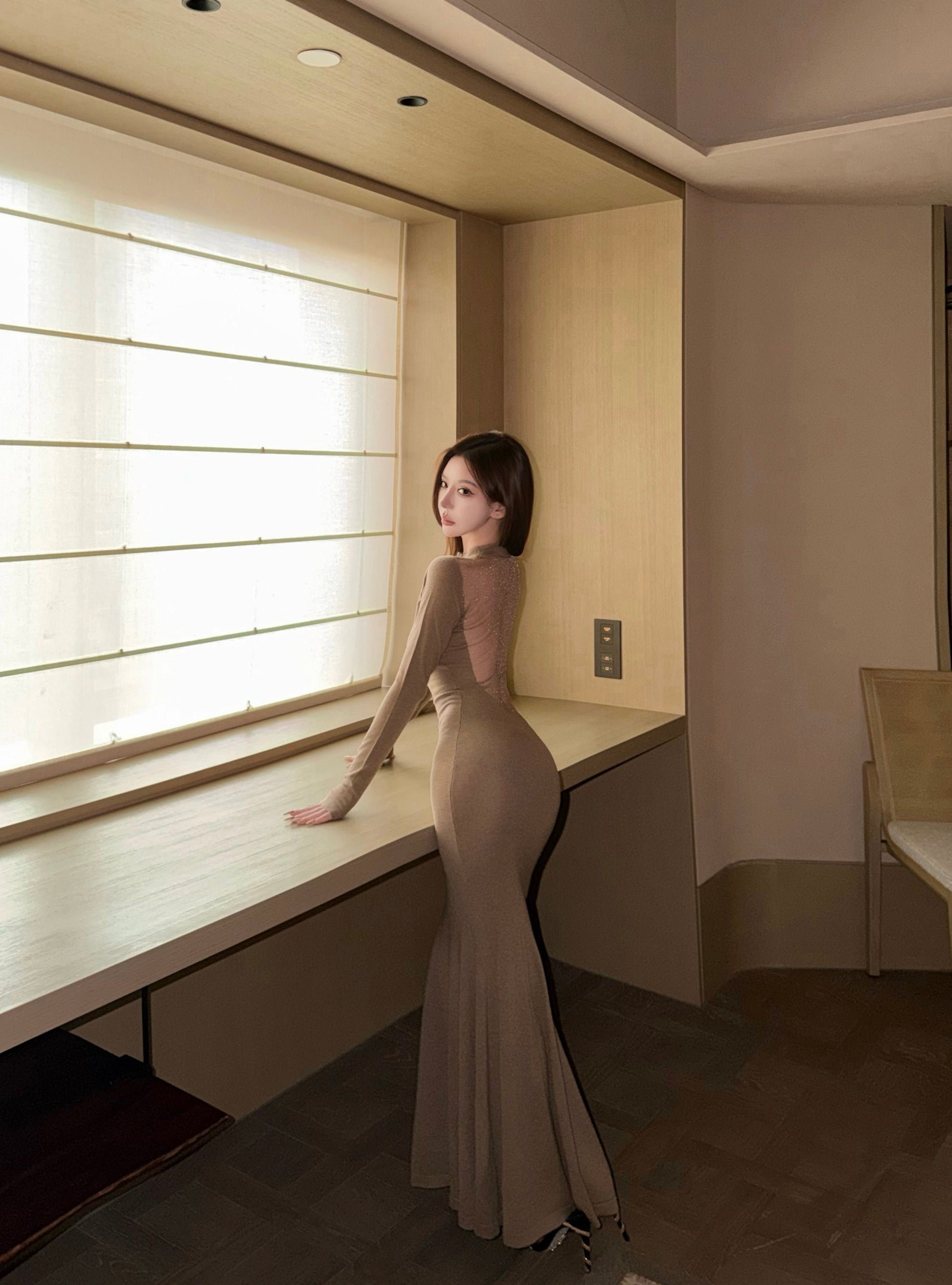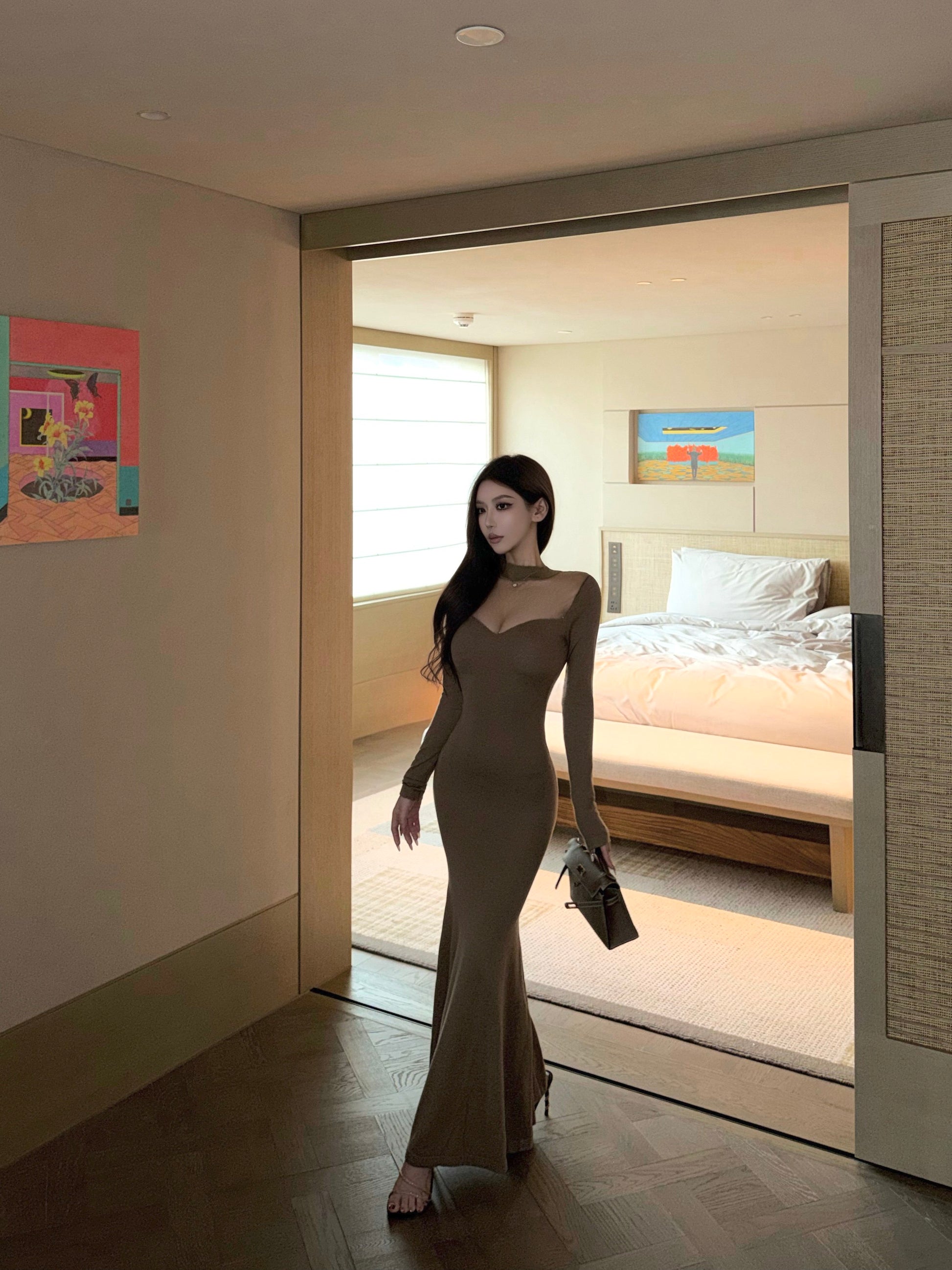 大胆に背中を大きく開いたホルターネックデザインが印象的な、長袖ニットロングワンピース。首元から背中へと流れるラインが美しく、後ろ姿まで計算された一着です。柔らかく伸縮性のあるニット素材が、身体に沿って自然にフィット。ウエストからヒップにかけて包み込むようなシルエットに、裾へと広がるマーメイドラインが、女性らしい曲線をより印象的に引き立てます。大胆なバックレスデザインでありながら、長袖とのバランスにより上品さを保ち、一枚で主役になる完成度の高いロングドレスに仕上げました。ナイトシーンや特別な日の装いに、自信を与えてくれる一着です。