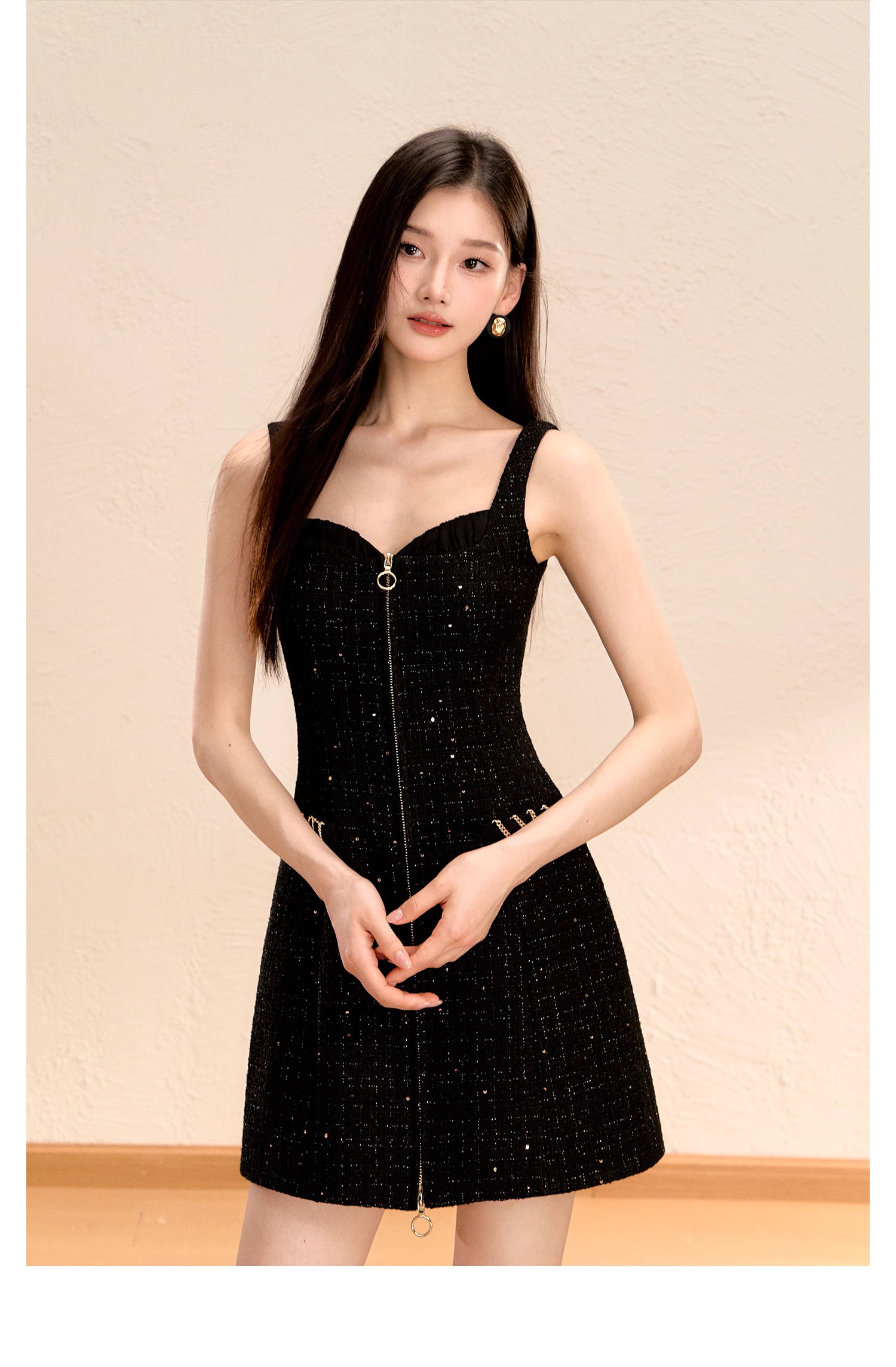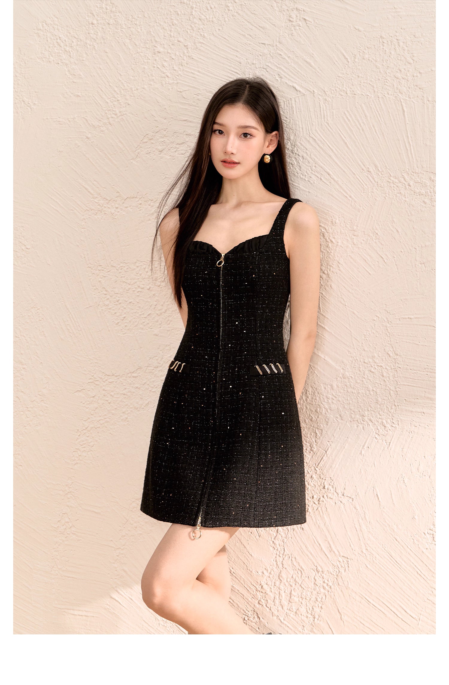 上品なツヤ感と立体シルエットが魅力の小黑裙。ハートネックでデコルテすっきり、フェミニンなムードをひとさじ。ウエストはきゅっと細見え、裾はミニ丈でバランスよく美脚ラインを強調。華奢ストラップが肩と鎖骨をきれいに見せて、気品と色気を両立。夏のパーティからデートまで一枚で完成する、洗練された“香奈兒風”ドレス。