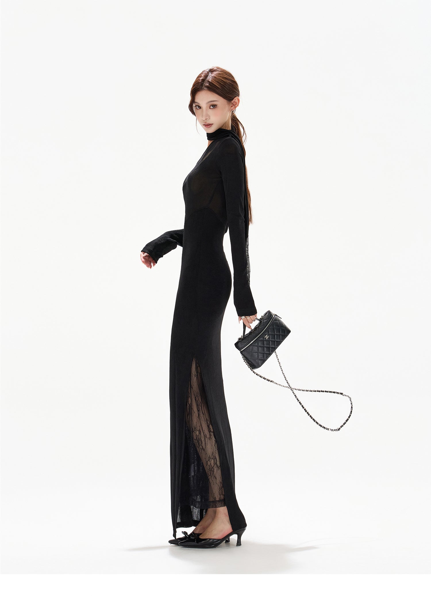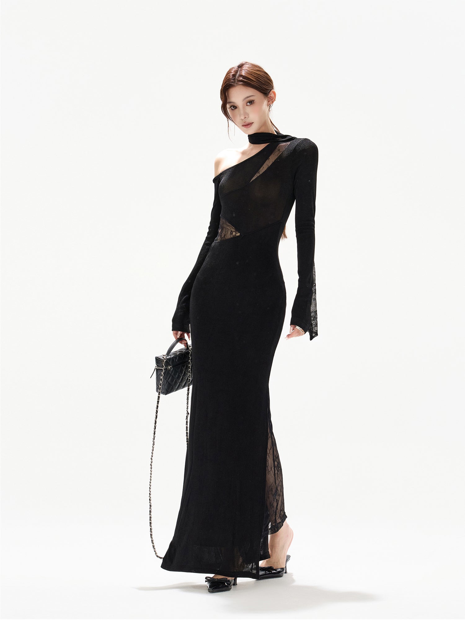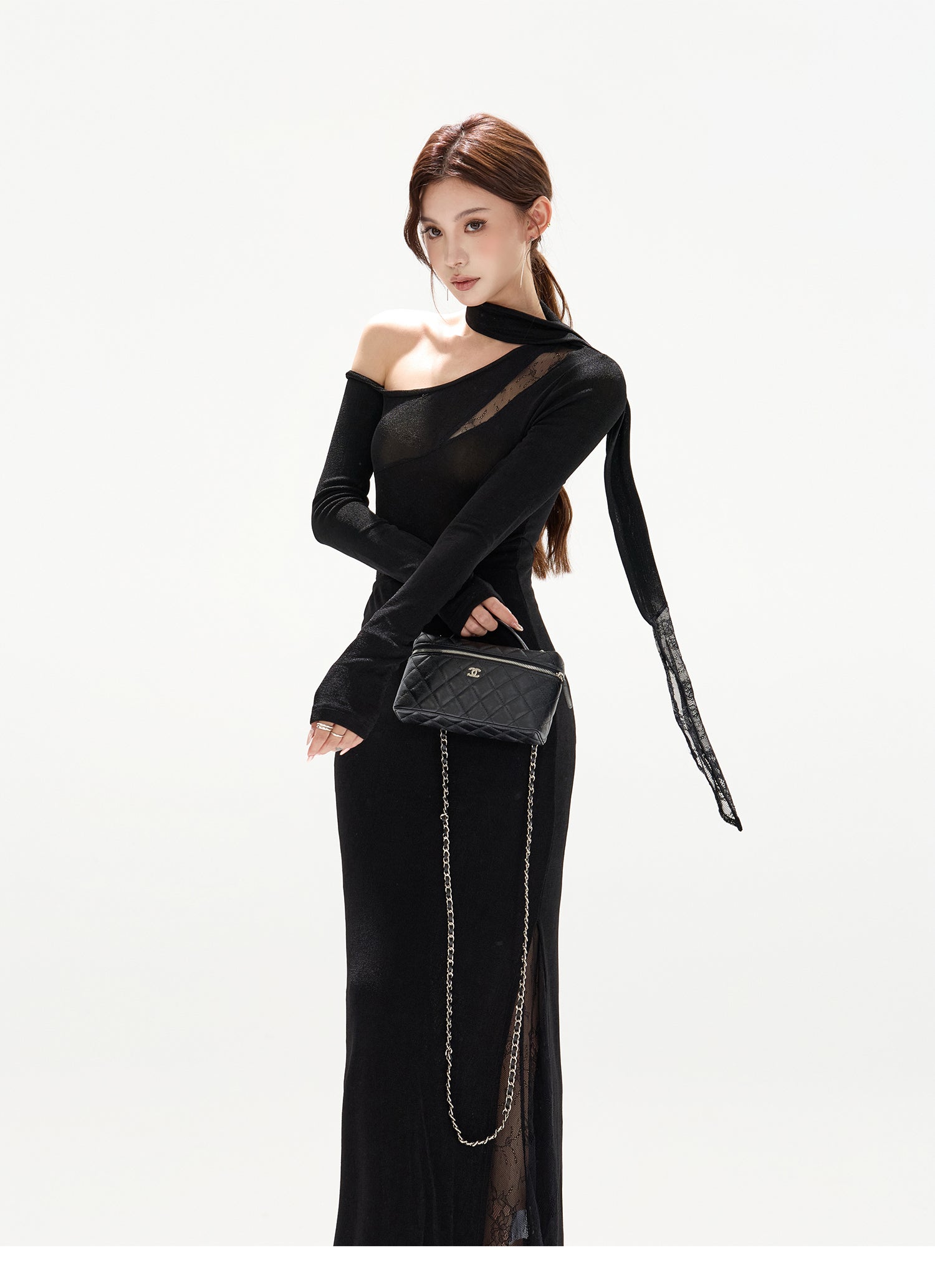 光をまとうような微かな輝き、大胆なレースとアシンメトリーなデザインが魅力のセクシーなニットドレス。パーティーシーンで一目置かれる、オリジナルデザインの斜め肩ラインが美しいロングワンピース;微光沢がかった生地に繊細なレースが絶妙に組み合わさり、フェミニンさとセクシーさを両立;体にフィットするシルエットが女性らしい曲線美を引き立て、どの角度から見ても華やかで上品な印象を与えます。エレガントなディテールでありながら、伸縮性のあるニット素材を使用しているので、長時間着用しても快適な着心地、特別なイベントやディナー、パーティーで、洗練された大人の魅力を最大限に引き出してくれる一着です。