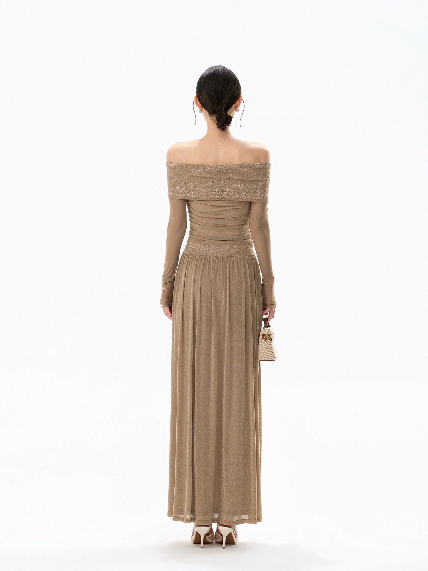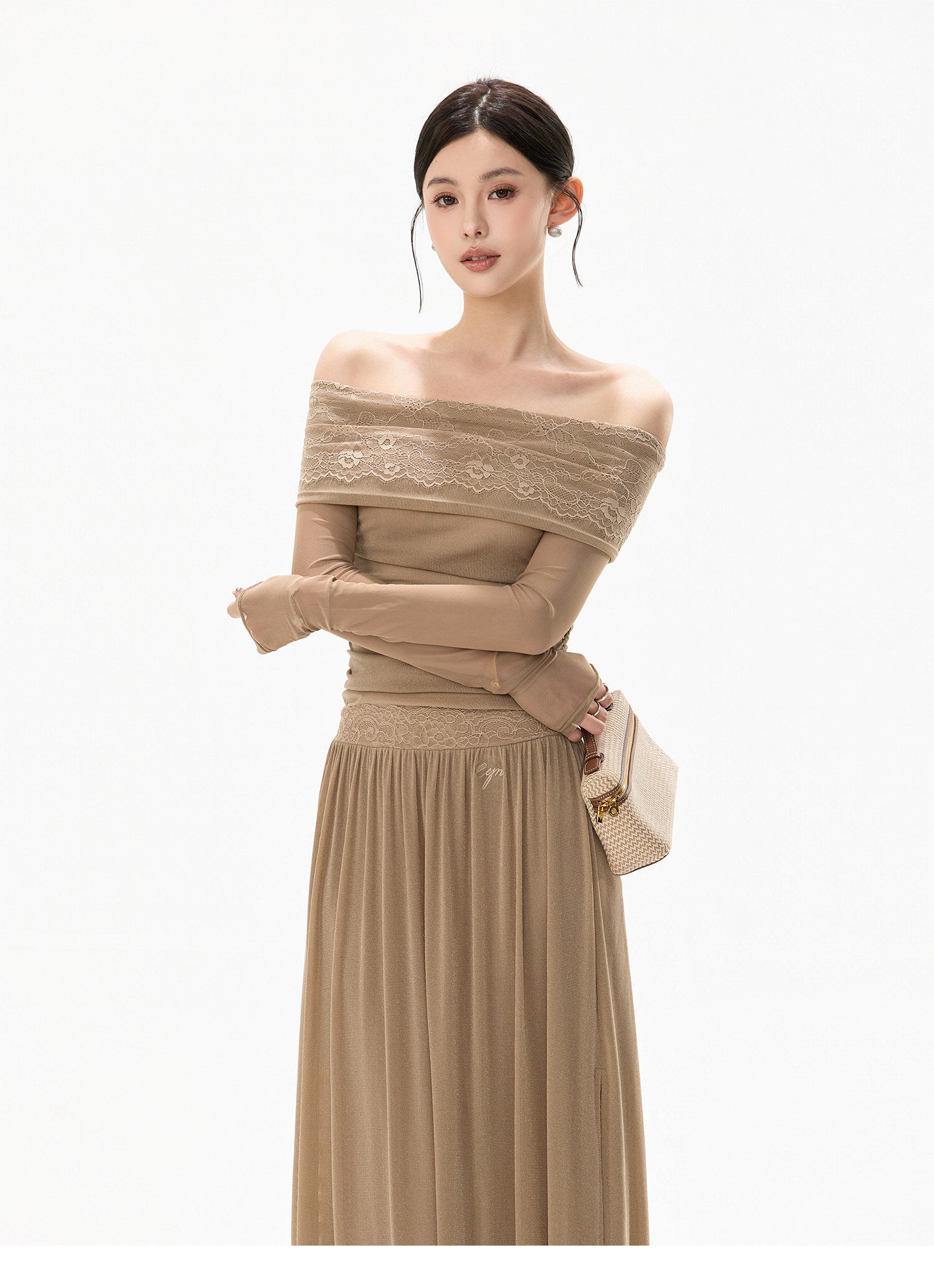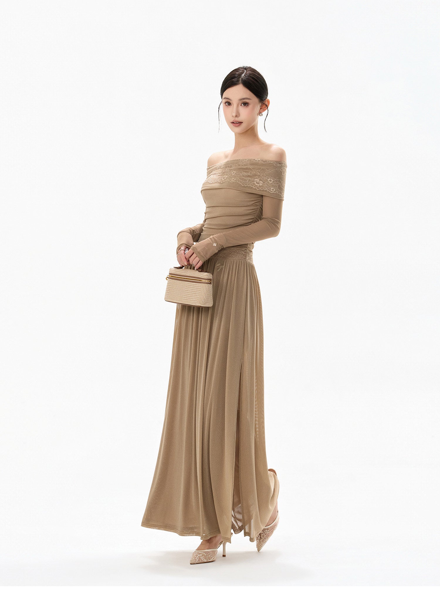 柔らかな霧のようなニュアンスを纏った、上品なレースオフショルダーワンピース、繊細なレースと軽やかなチュール素材を重ね、透明感あふれるフェミニンな印象に仕上げました;デコルテを美しく見せる一字肩デザインが、ほどよい抜け感と女性らしさを演出。