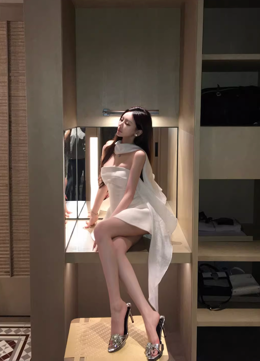 上品なホワイトでまとめたオフショルダーデザインが、デコルテラインをすっきりと魅せる一枚。軽やかに揺れるピュアなリボンが、程よいフェミニンさを添えつつ、スタイル全体に立体感をプラス。ウエストは自然に引き締まるシルエットで、身体のラインを綺麗に整えながら、Aラインの広がりが脚をより美しく魅せてくれる。清潔感と色気を両立したデザインで、特別な日の装いにも万能な一着。