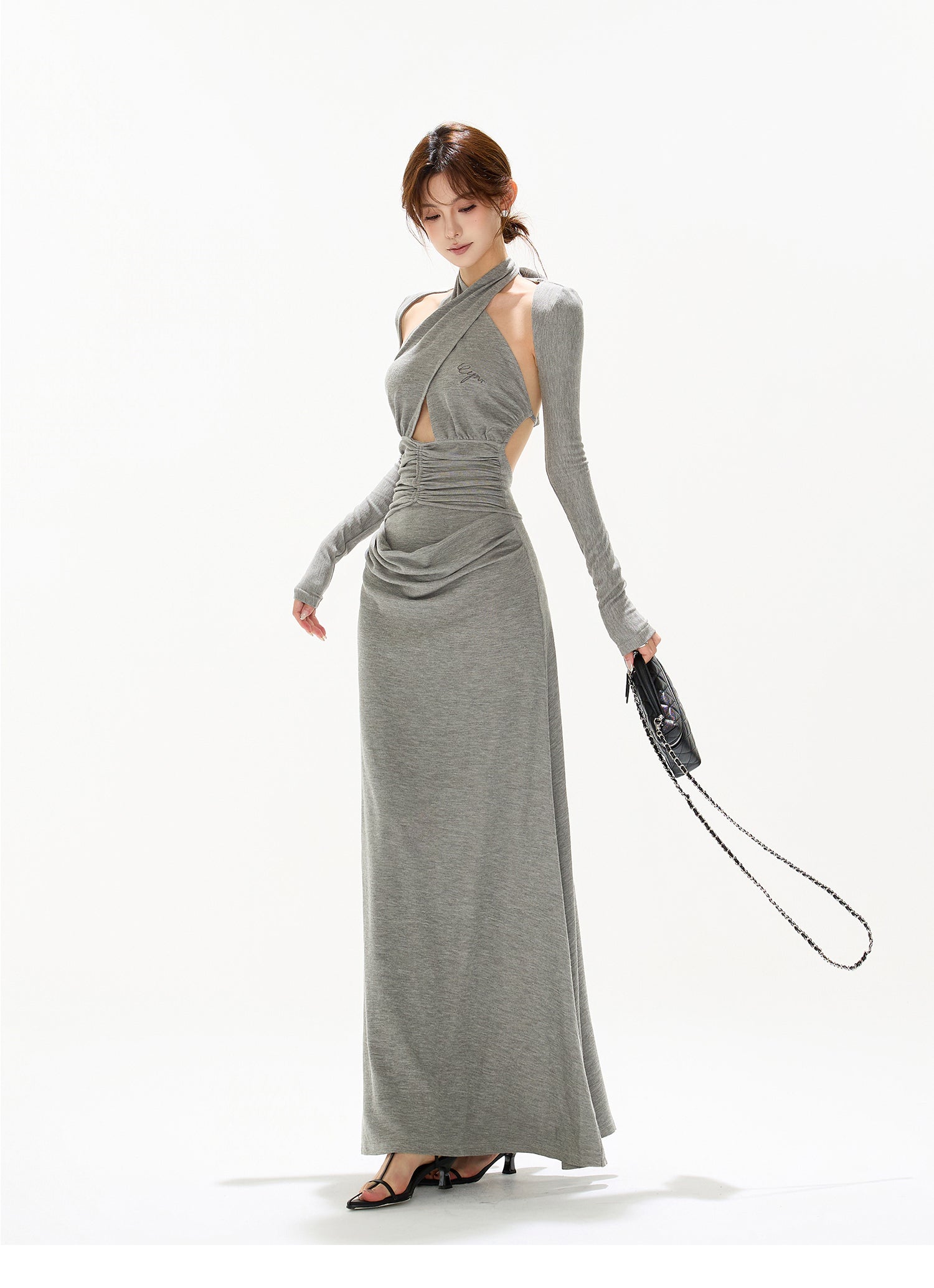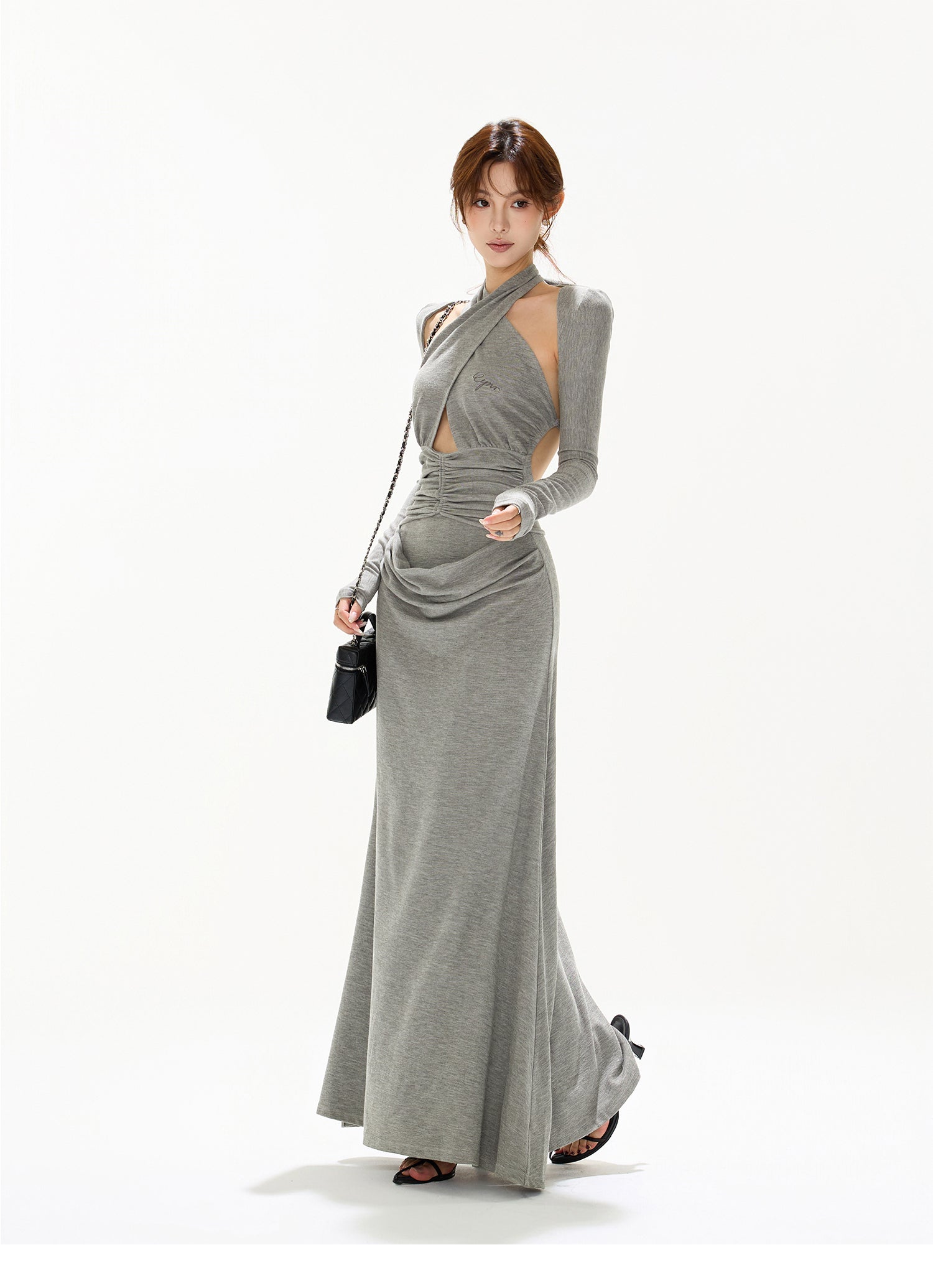 デザイン性の高いクロスホルターネックワンピース。背中のカッティングがヘルシーな色気を引き出し、ウエストギャザーと高伸縮素材で美しいボディラインを演出。1枚でクールな大人ムードを、秋冬はジャケットやコートを重ねて季節感のあるスタイルに。モード感と女性らしさを兼ね備えた、ワードローブに欠かせない一着。
