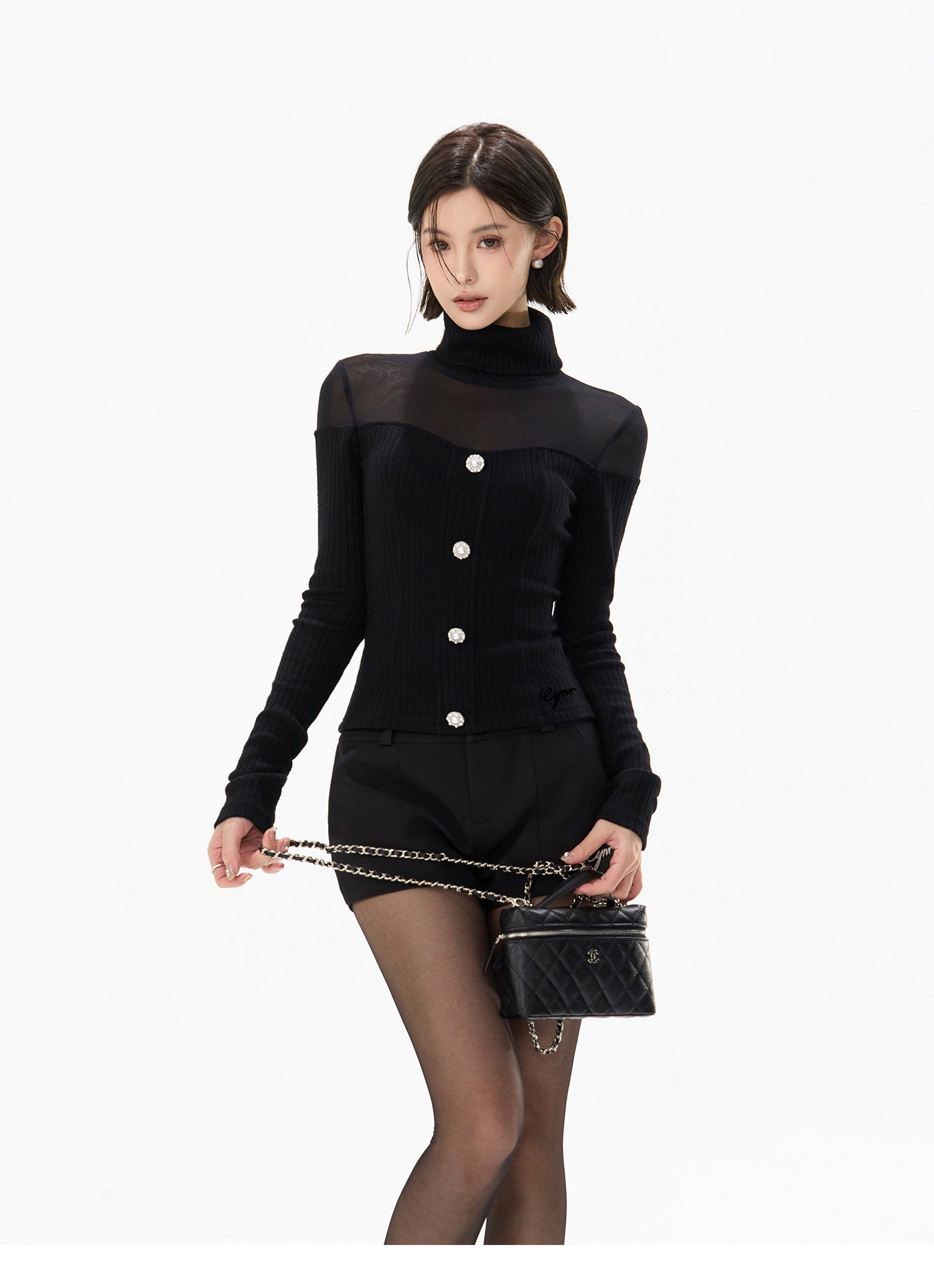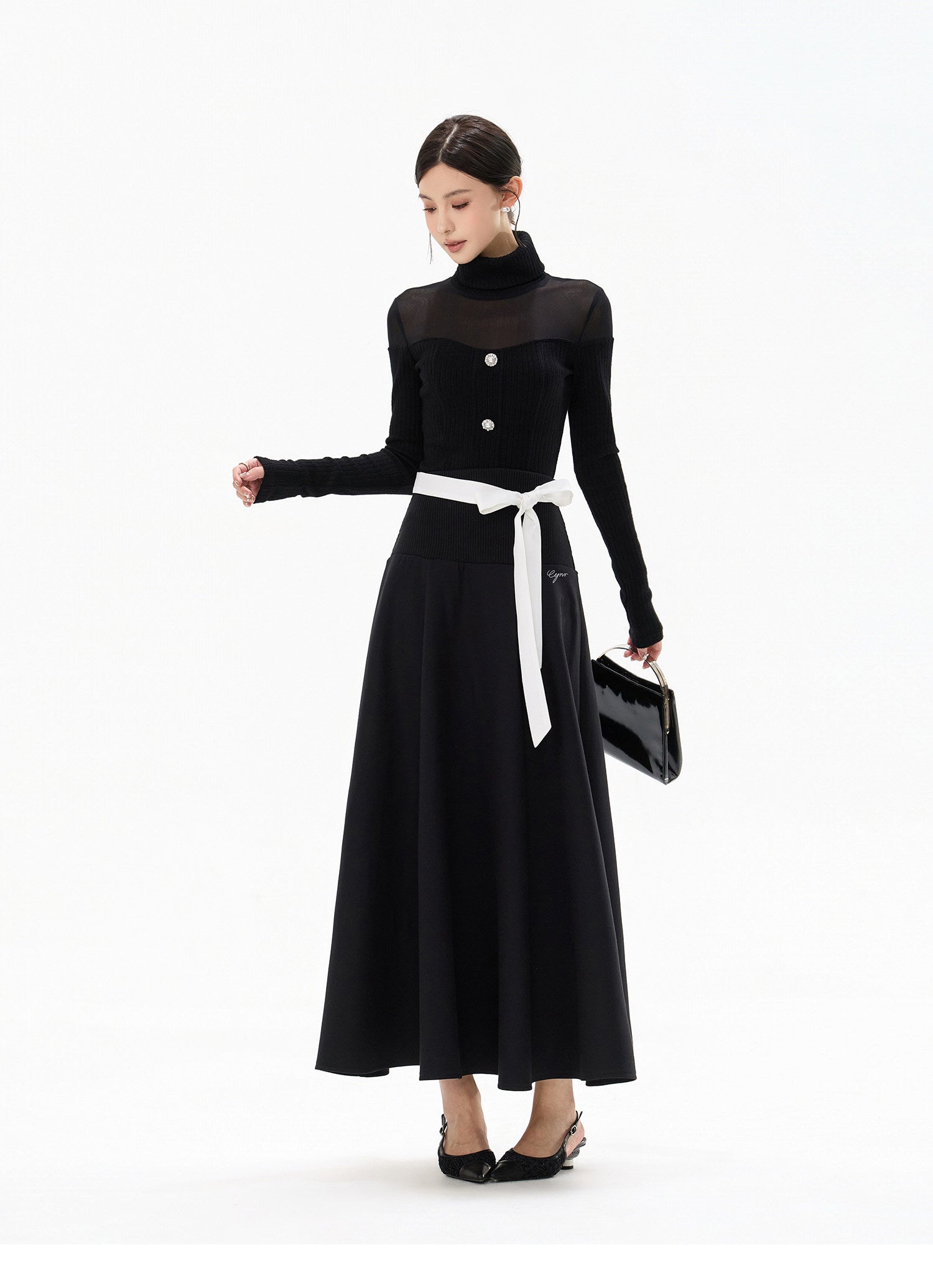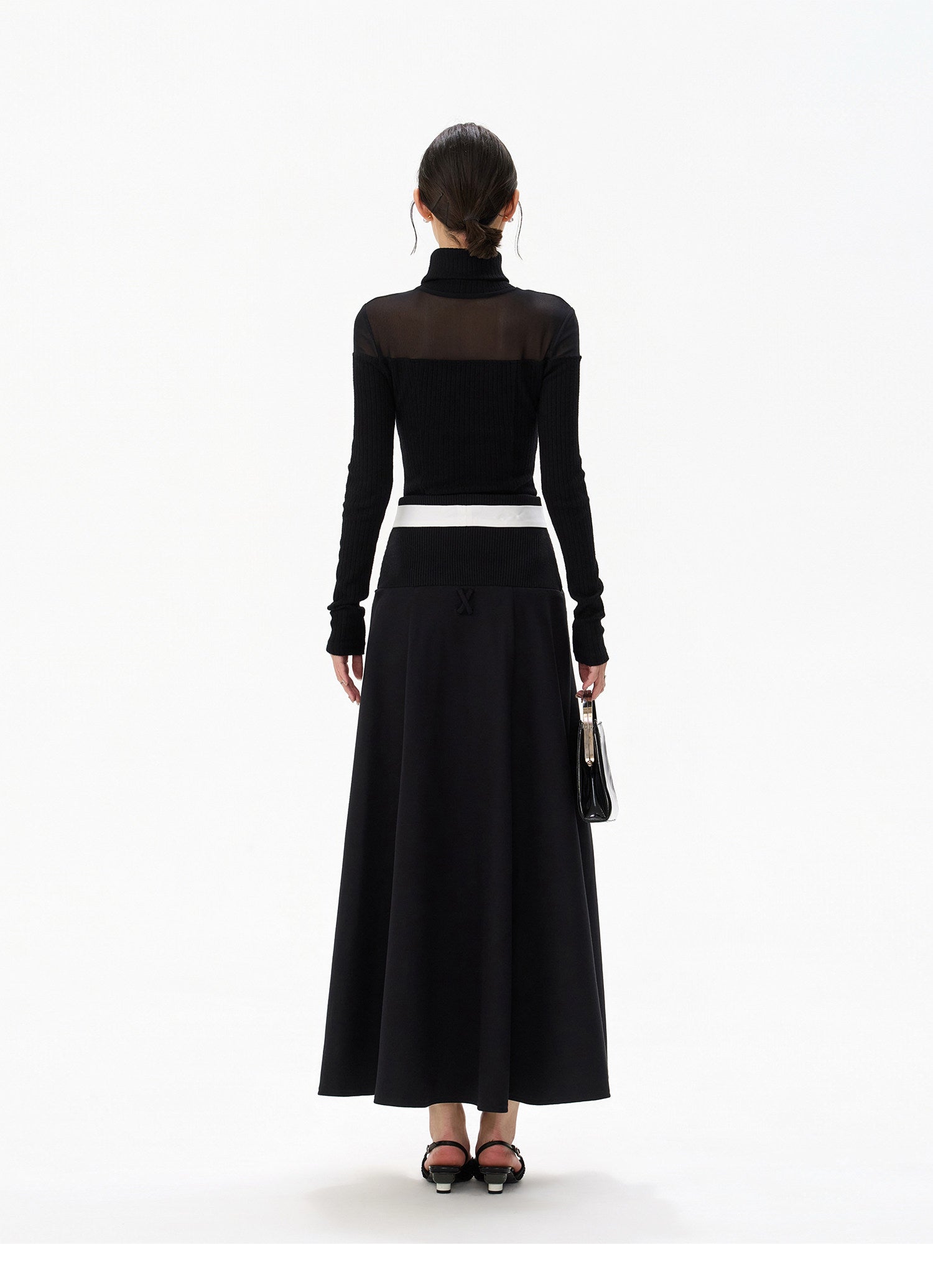 シアーメッシュ切り替えのハイネックニットトップスと、コントラストベルト付きフレアスカートのセットアップ。トップスはさりげない肌見せが叶うメッシュデザインで、ウエストラインをきれいに見せるシルエット。半ハイネック仕様で上品さを保ちながら、女性らしい抜け感を演出します。スカートは配色ベルトがアクセントになり、ウエストを引き締めつつ自然にスタイルアップ。広がりすぎないフレアラインで、クラシカルな“ヘプバーン風”シルエットに。単品使いはもちろん、セットで着れば統一感のある洗練コーデが完成する一着です。