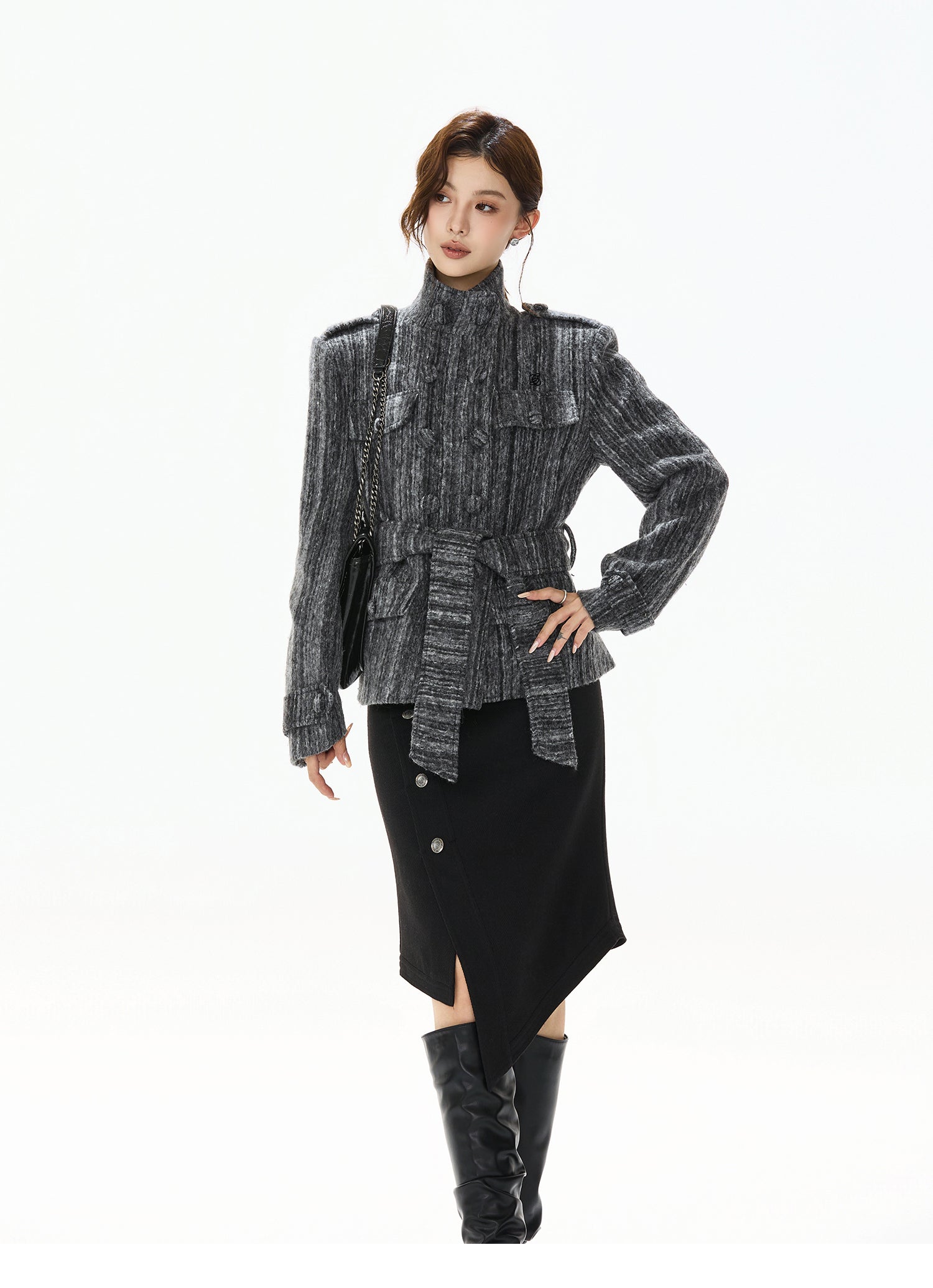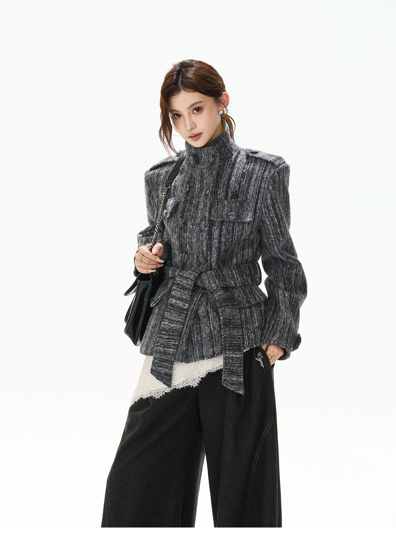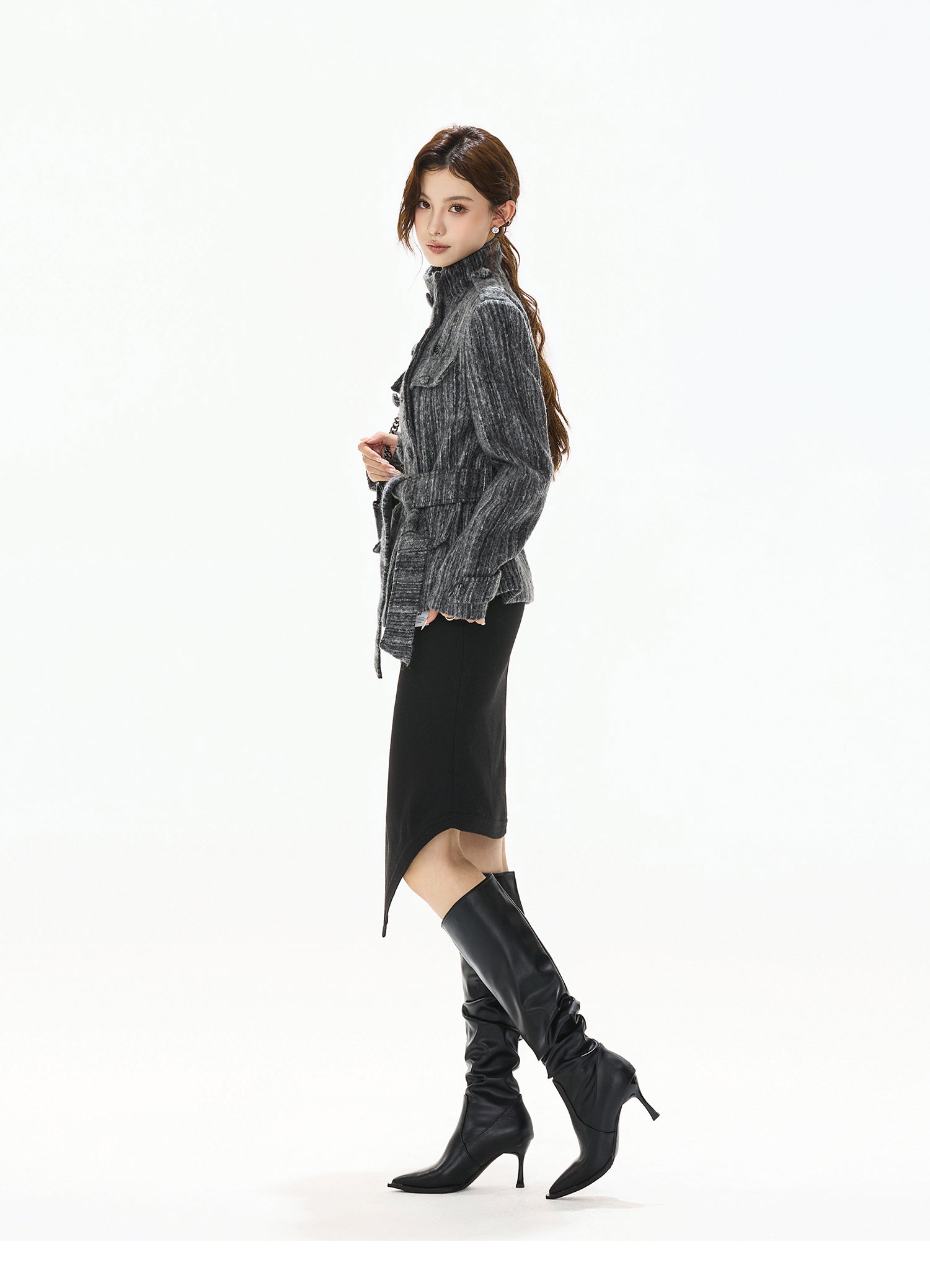 上質なストライプツイード素材を使用した、立体感のあるスタンドカラーロングコート。