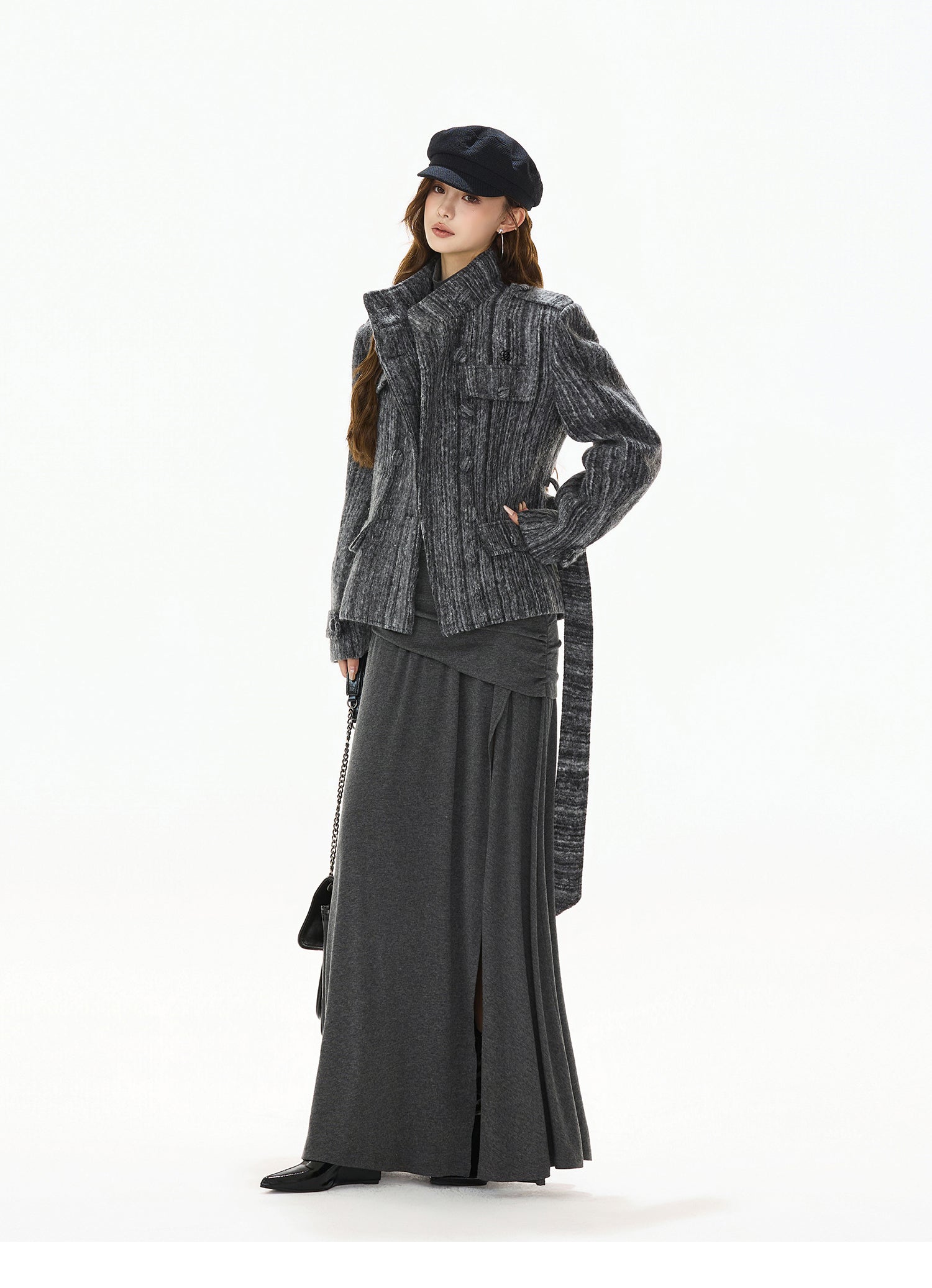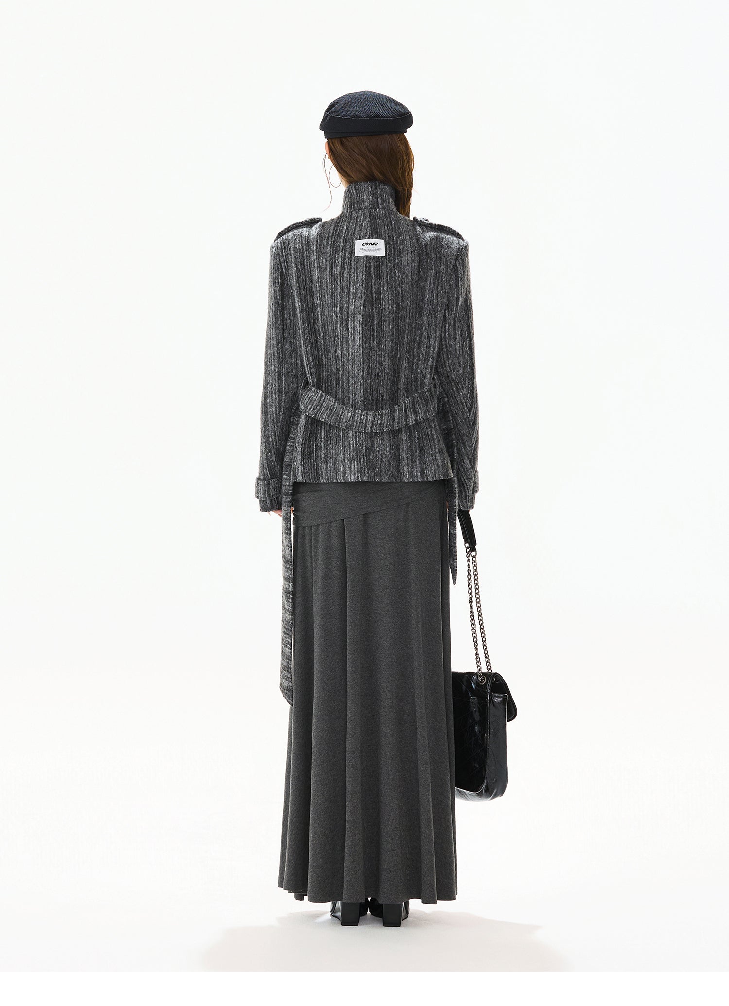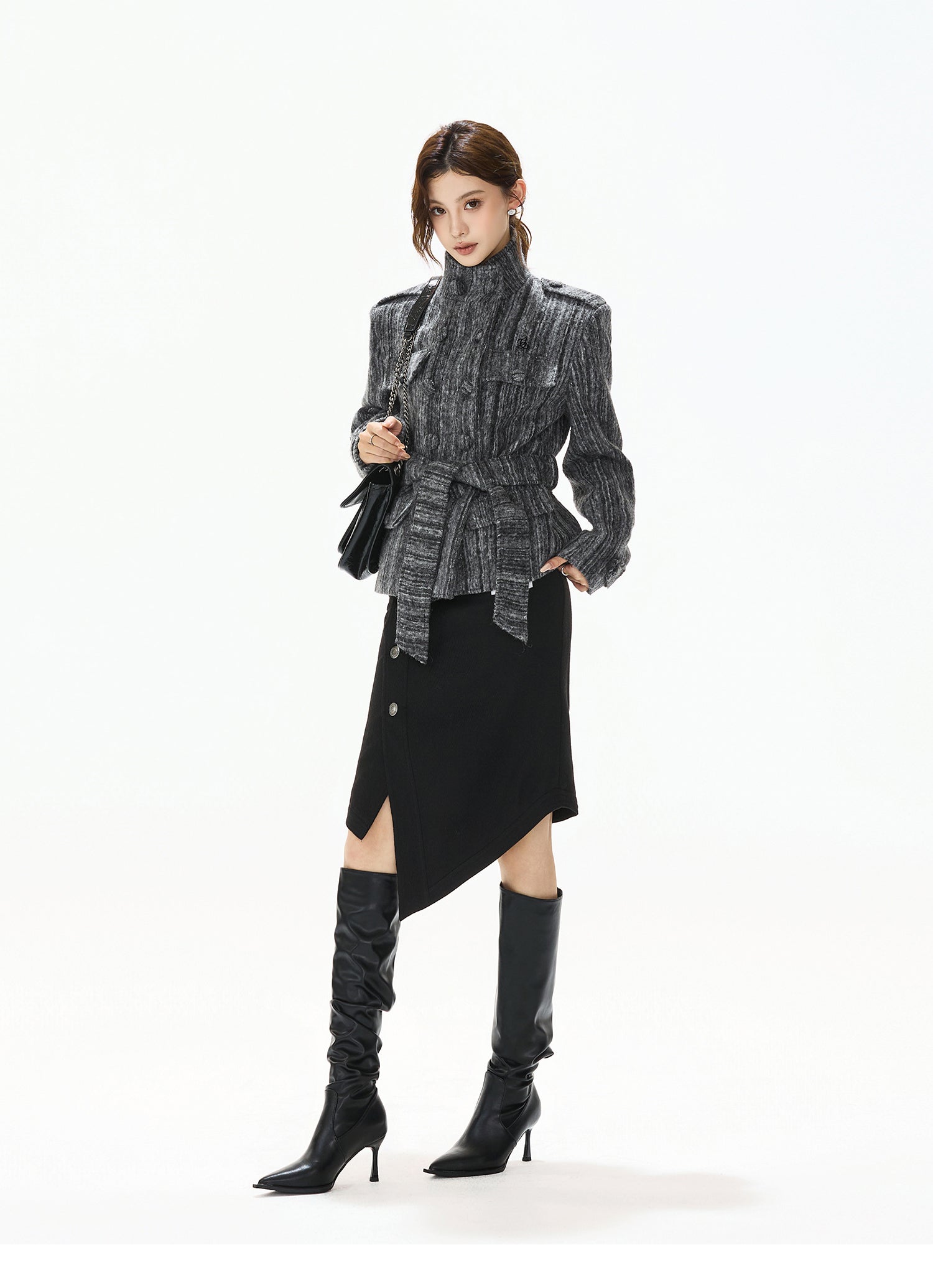 上質なストライプツイード素材を使用した、立体感のあるスタンドカラーロングコート。