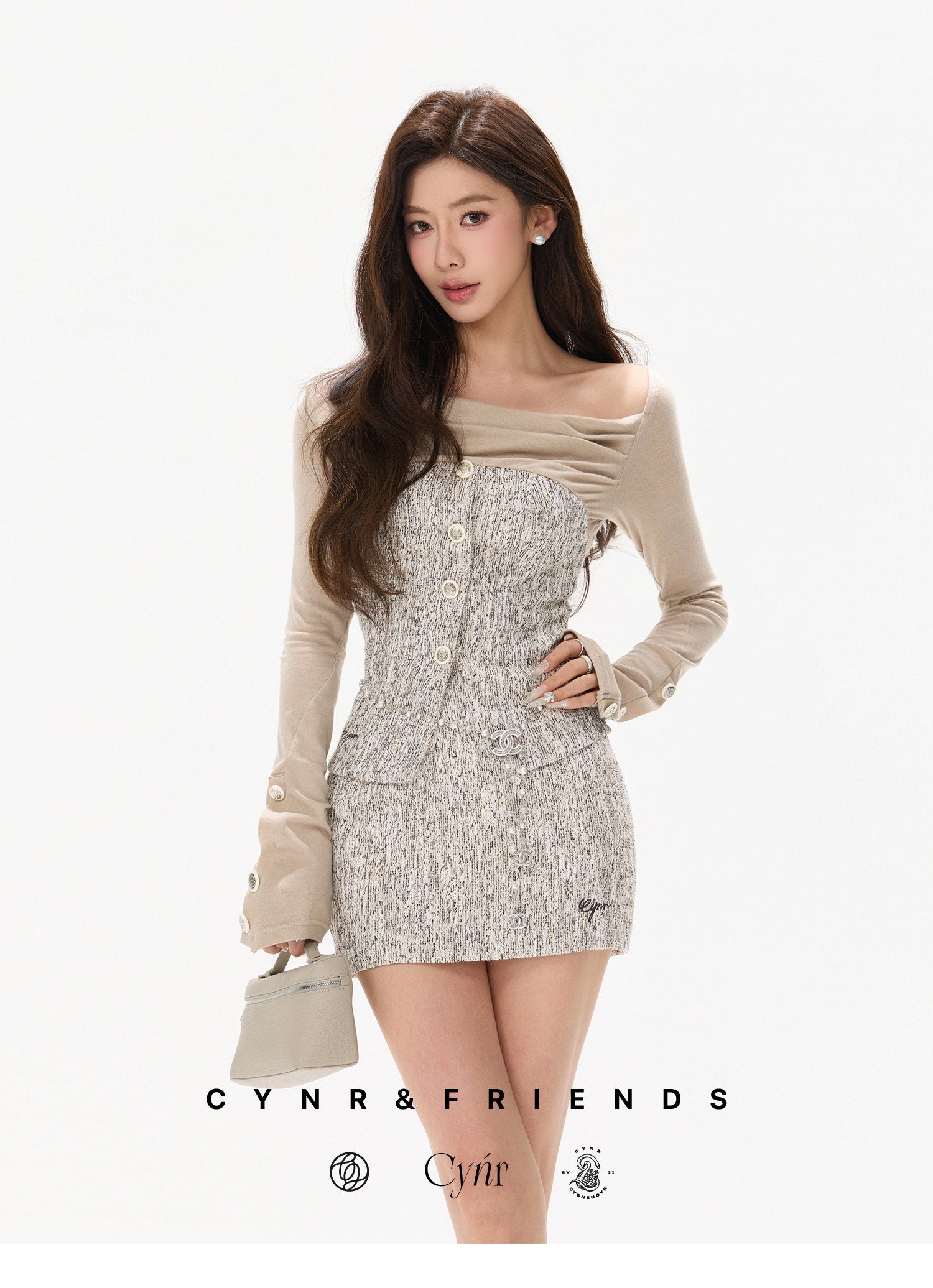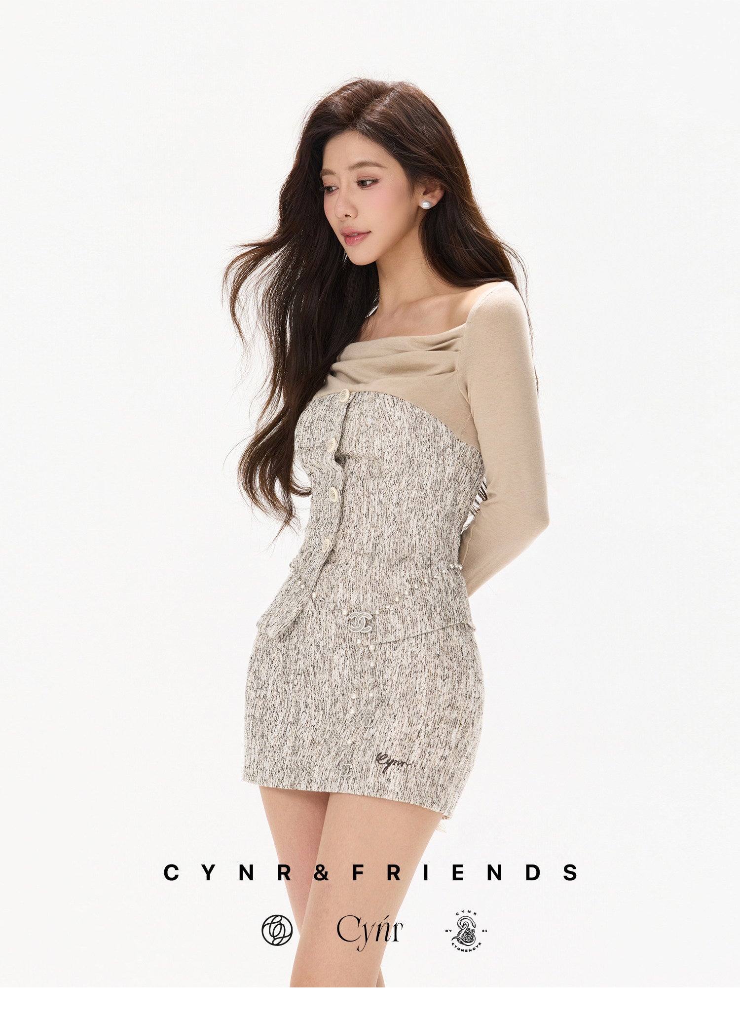 クラシックなツイード調ニットが印象的な、上品なセットアップ、花糸を織り込んだ表情豊かなニット素材が、さりげない華やかさを演出してくれます。トップスはオフショルダー風のデザインで、デコルテをきれいに見せてくれる女性らしいシルエット。レイヤード風のデザインがポイントになり、一枚でもスタイリングが完成するアイテムです。スカートはハイウエストのAラインシルエットで、脚をすっきりと長く見せてくれるバランスに。程よくコンパクトな丈感で、軽やかな印象に仕上げています。セットで着るのはもちろん、トップスとスカートをそれぞれ単品でも着回し可能。デイリーからお出かけまで幅広く活躍してくれる一着です。